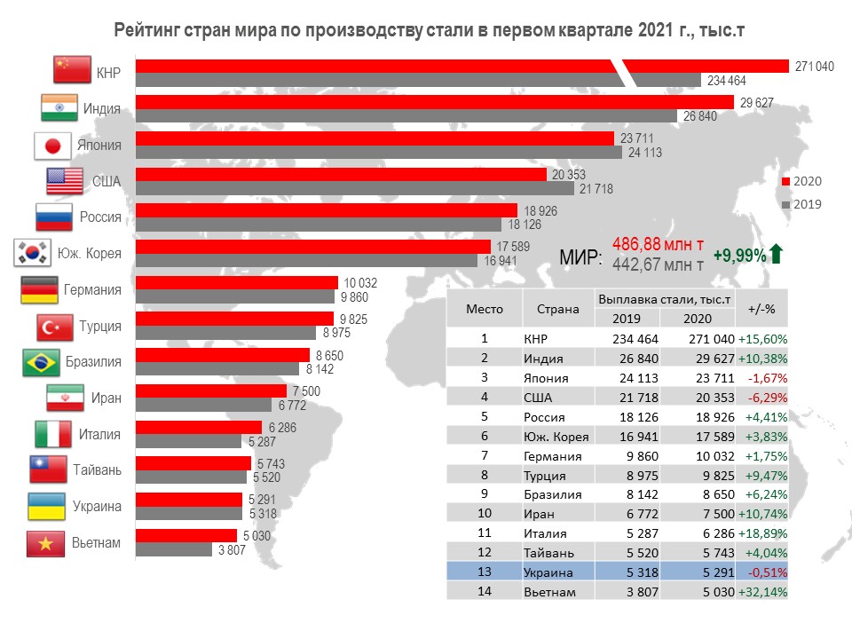 Мировая выплавка стали в первом квартале 2021 г. составляет 486,88 млн т, что на 9,99% выше показателя трех месяцев 2020 г. (442,67 млн т.).