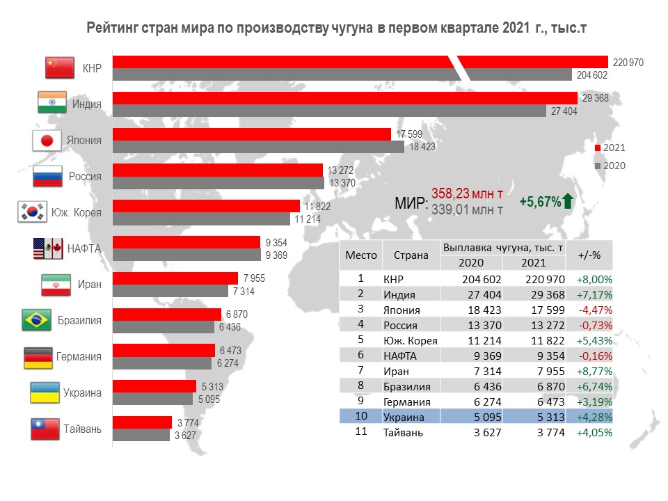 Украина (5,31 млн т или 104,3% относительно января-марта 2020 г.) занимает 10-ю позицию среди 38 стран-производителей чугуна.