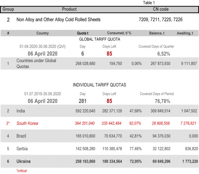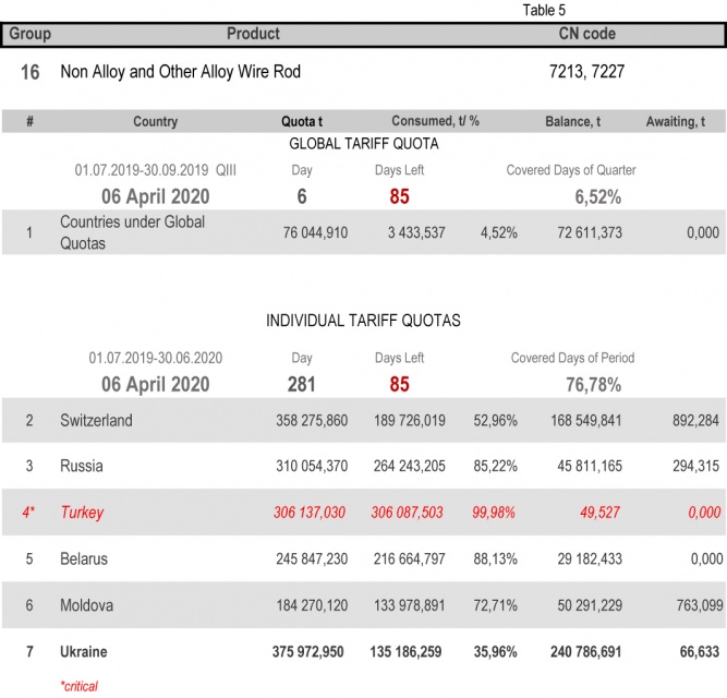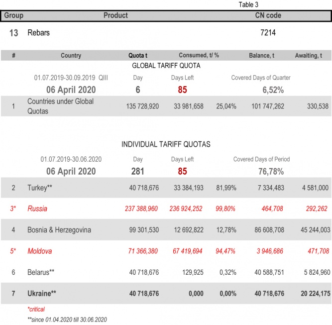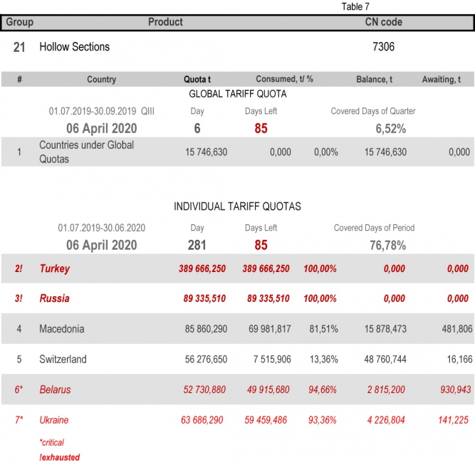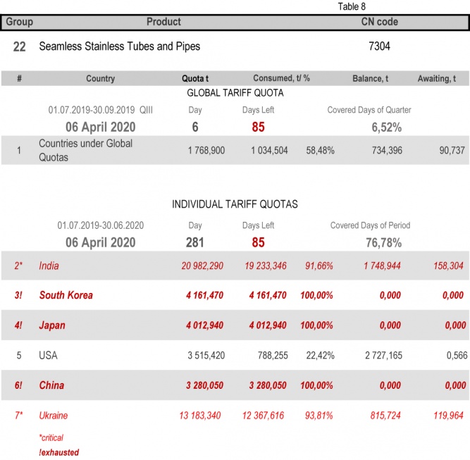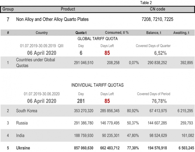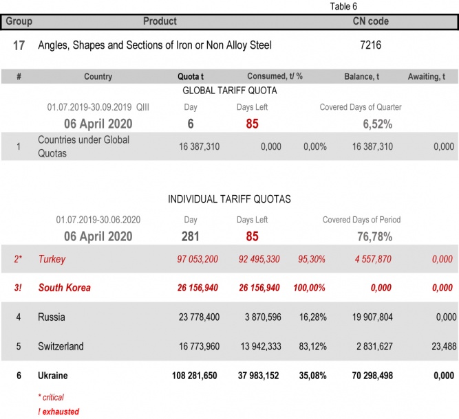 For the category 20 (gas pipes) in which Ukraine is a participant of the global tariff quota, on state of 6th April 2020 (6.52% of the covered quarter), the consuming level is 6.41%. More detailed http://www.ukrmetprom.org/tariff-quota-usage-ukrainian-steel-products-import-eu-daily-monitoring-15-07-2019/