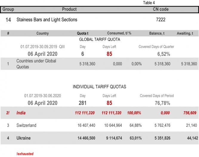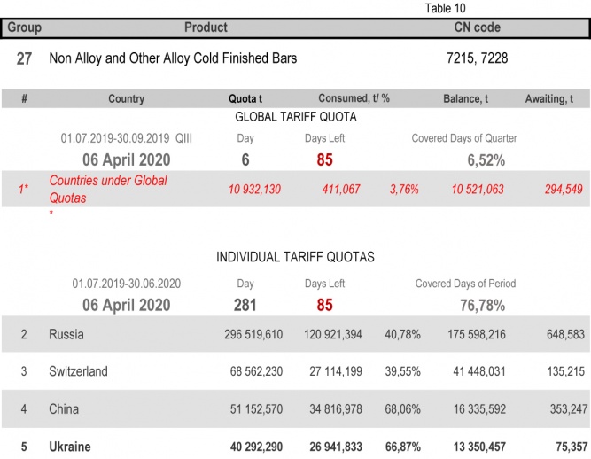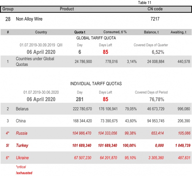 On state of 6th April 2020 (76.78% of the covered period) the most consumed individual tariff quota is in category 28 (rebarsNon-Alloy Wire) – 95,10%. The least consuming is in category 17 (Angles, Shapes and Sections of Iron or Non Alloy Steel), 35.08%.