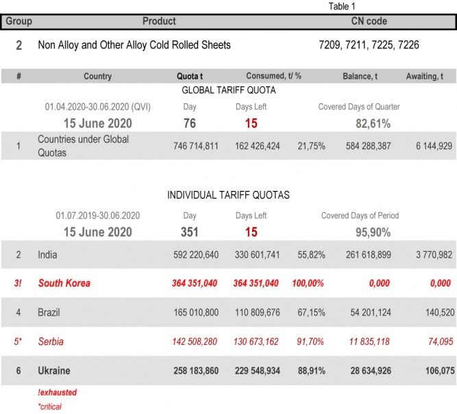 For the category 20 (gas pipes) in which Ukraine is a participant of the global tariff quota, on state of 15th June 2020 (82.61% of the covered quarter), the quota is exhausted. More detailed http://www.ukrmetprom.org/tariff-quota-usage-ukrainian-steel-products-import-eu-daily-monitoring-15-07-2019/