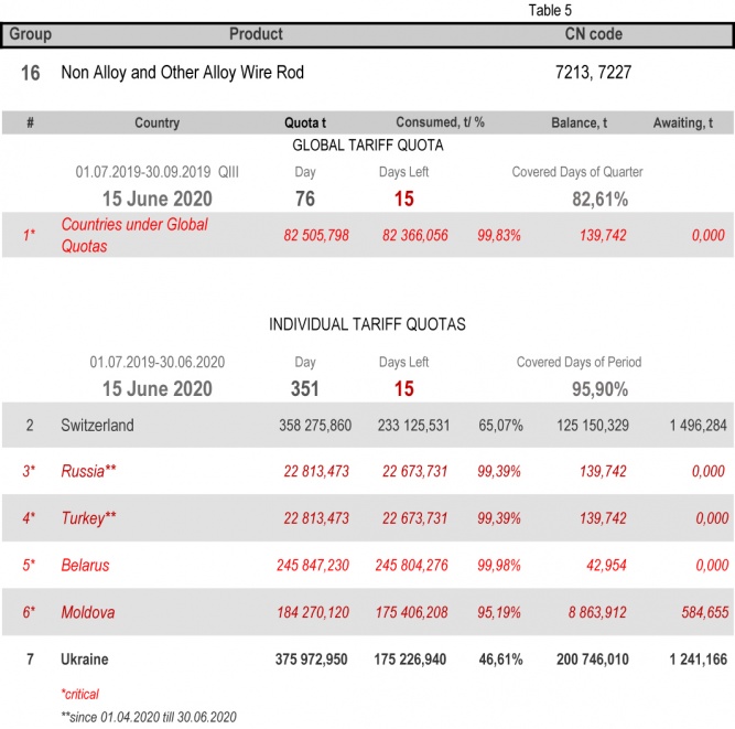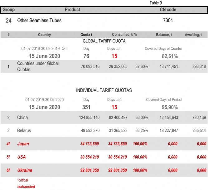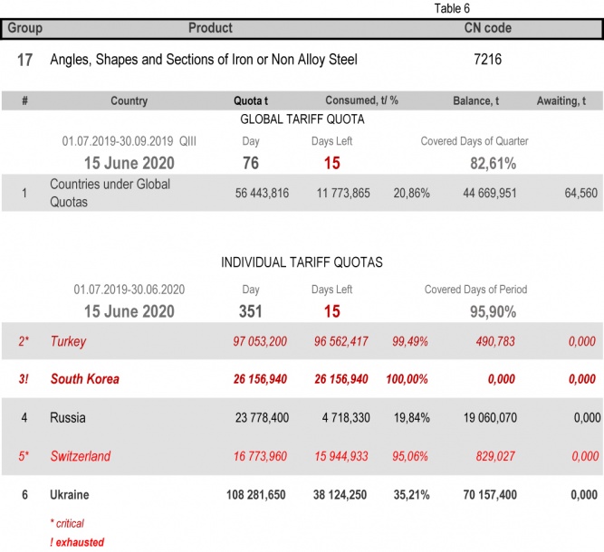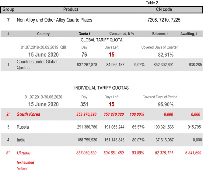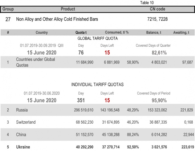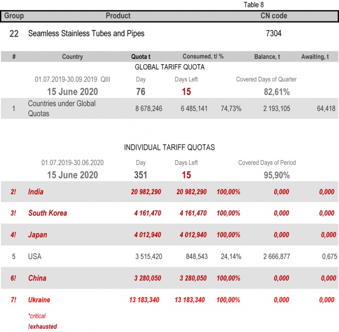On state of 15th June 2020 (95.90% of the covered period) Ukraine had fully consumed the individual tariff quota in category 22 (Seamless Stainless Tubes and Pipes) and category 24 (Other Seamless Pipes). The least consuming is in category 17 (Angles, Shapes and Sections of Iron or Non Alloy Steel), 35.21%.