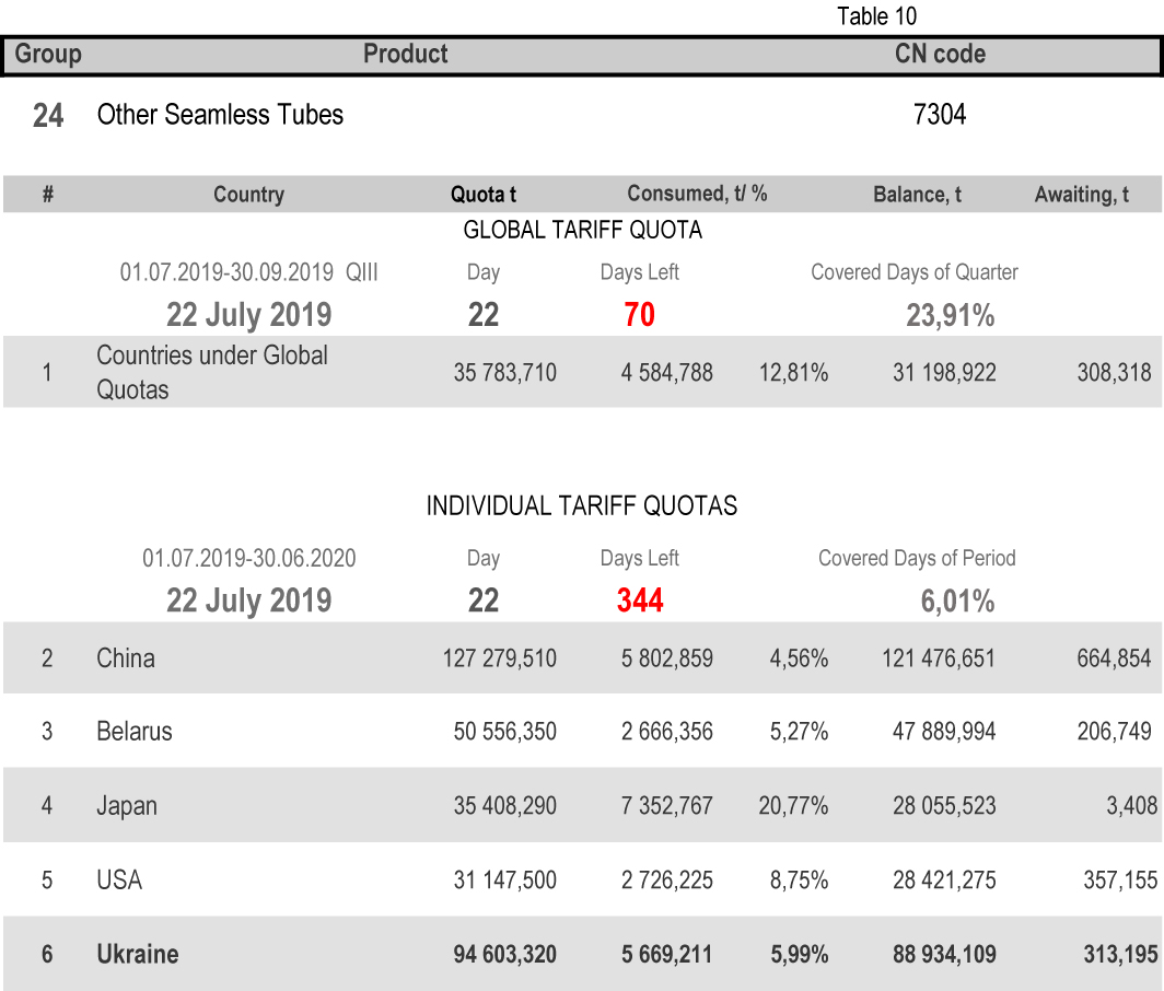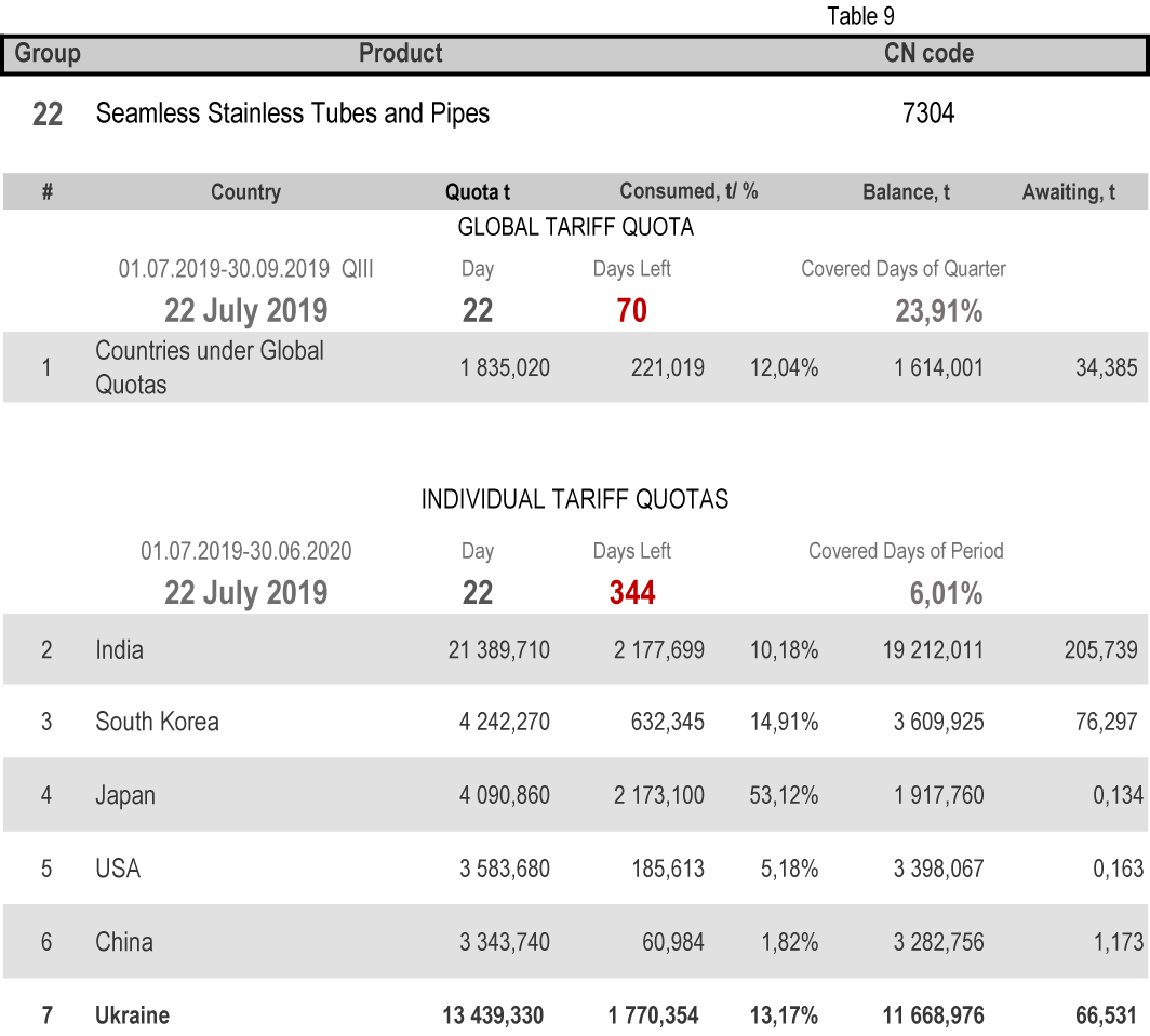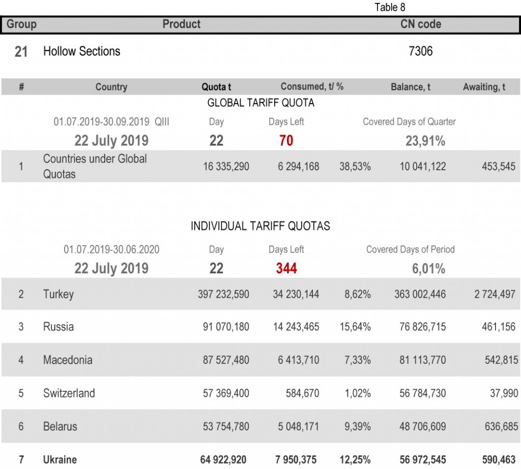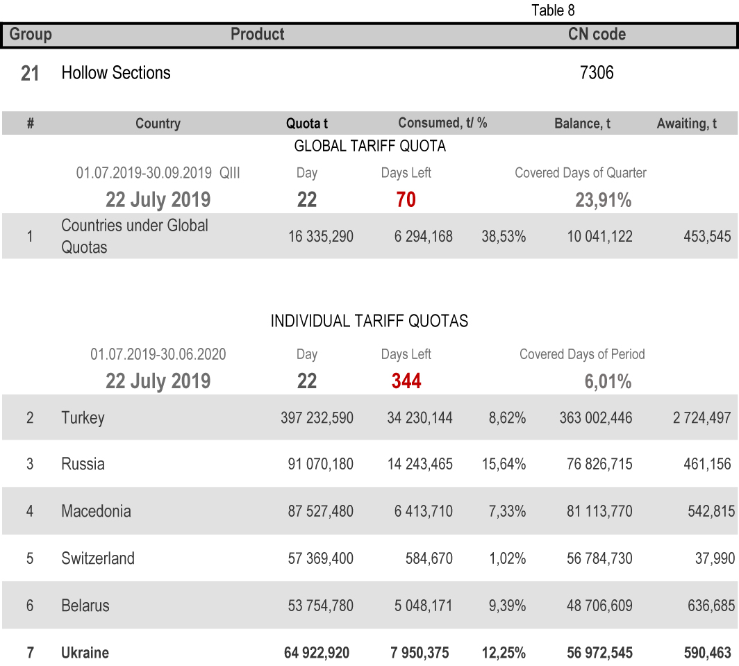 For categories in which Ukraine is a participant of the global tariff quota, on state of 22nd July 2019 (23.91% of the covered quarter), 18.46% had been consumed in category 1 (non-alloy and other alloy hot rolled sheets and strips) and 65.21% in category 20 (gas pipes). More detailed