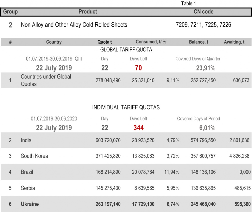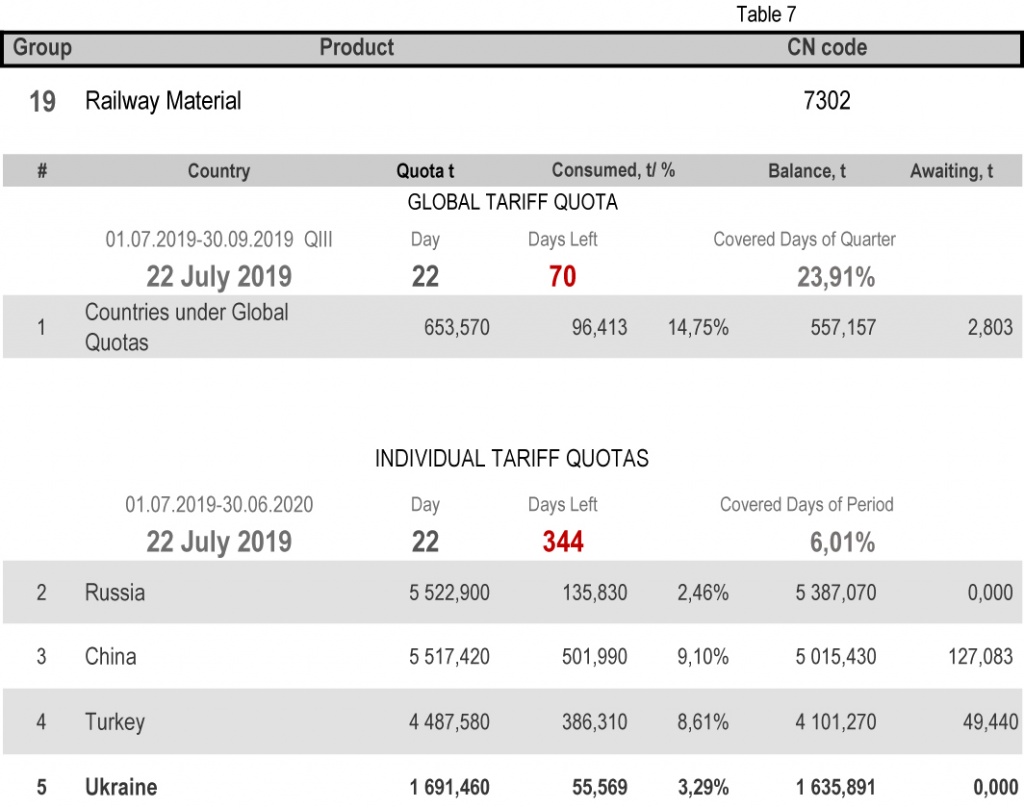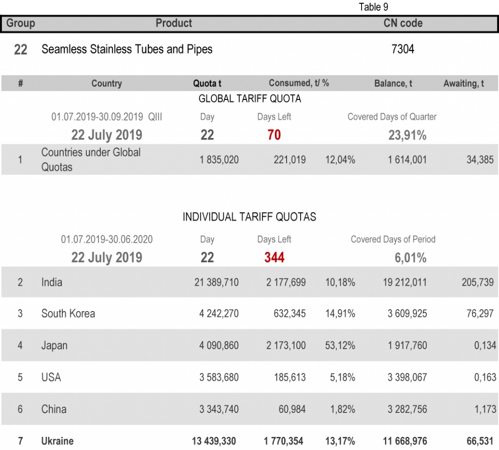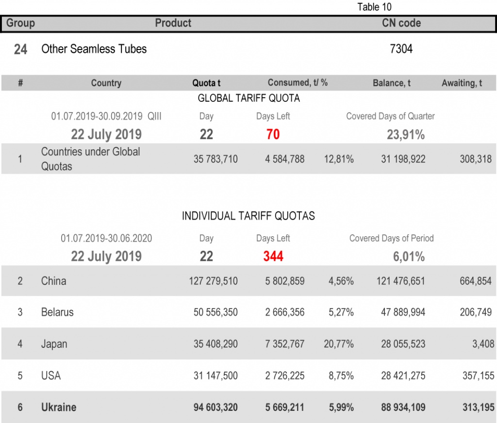 For categories in which Ukraine is a participant of the global tariff quota, on state of 22nd July 2019 (23.91% of the covered quarter), 18.46% had been consumed in category 1 (non-alloy and other alloy hot rolled sheets and strips) and 65.21% in category 20 (gas pipes). More detailed