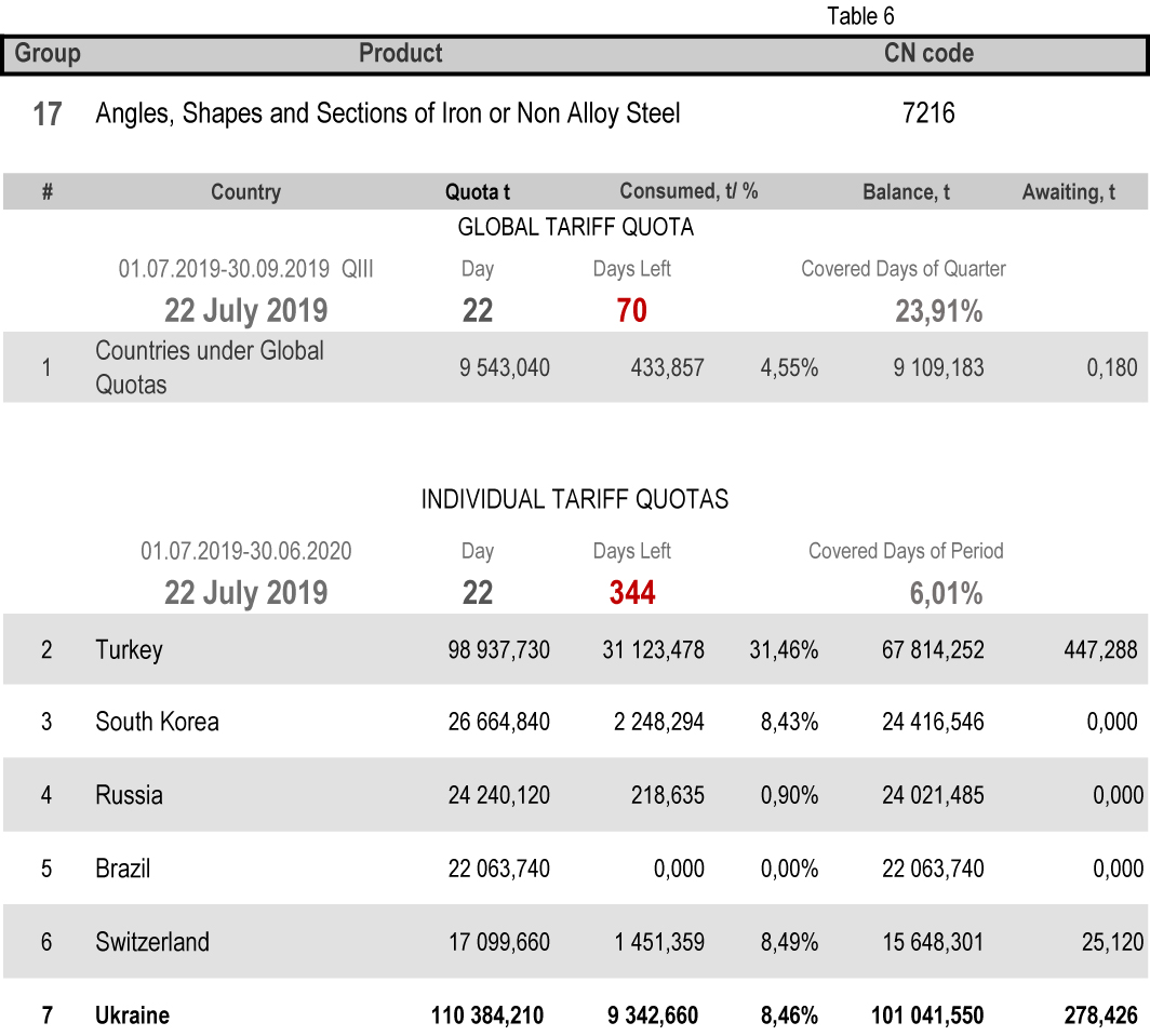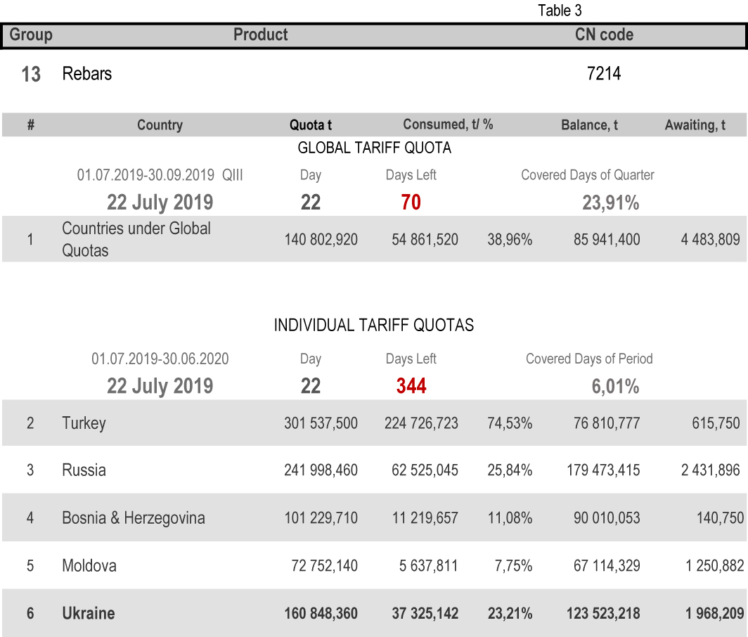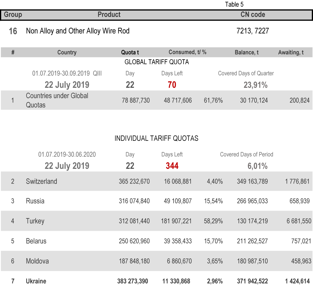 On state of 22nd July 2019 (6.01% of the covered period) the most consumed individual tariff quota is in category 13 (rebars) – the application level is 23.21%. The least consuming is in category 16 (non-alloy and other alloy wire rods), 2.96%. More detailed