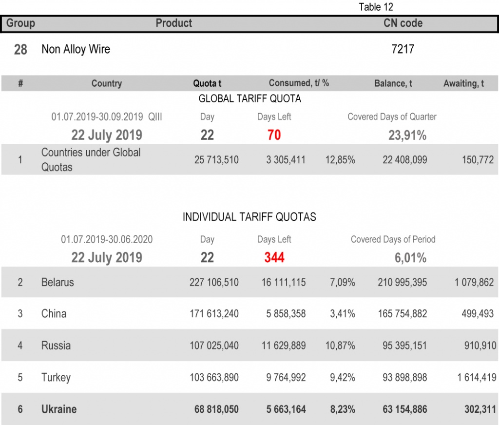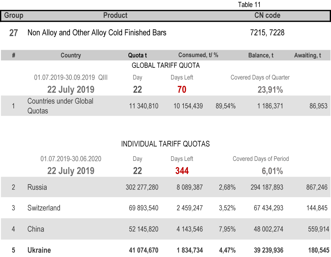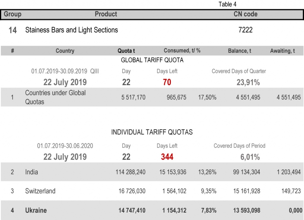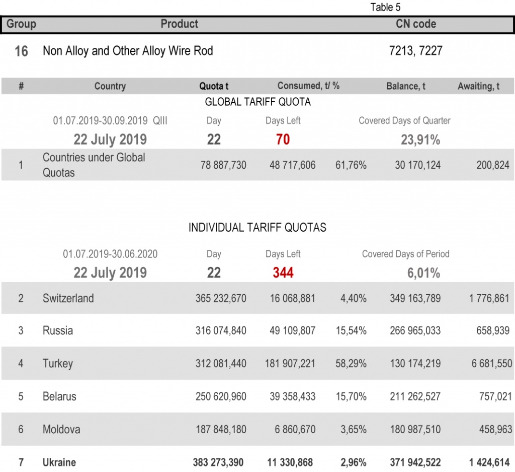 On state of 22nd July 2019 (6.01% of the covered period) the most consumed individual tariff quota is in category 13 (rebars) – the application level is 23.21%. The least consuming is in category 16 (non-alloy and other alloy wire rods), 2.96%. More detailed