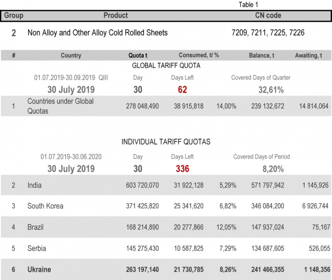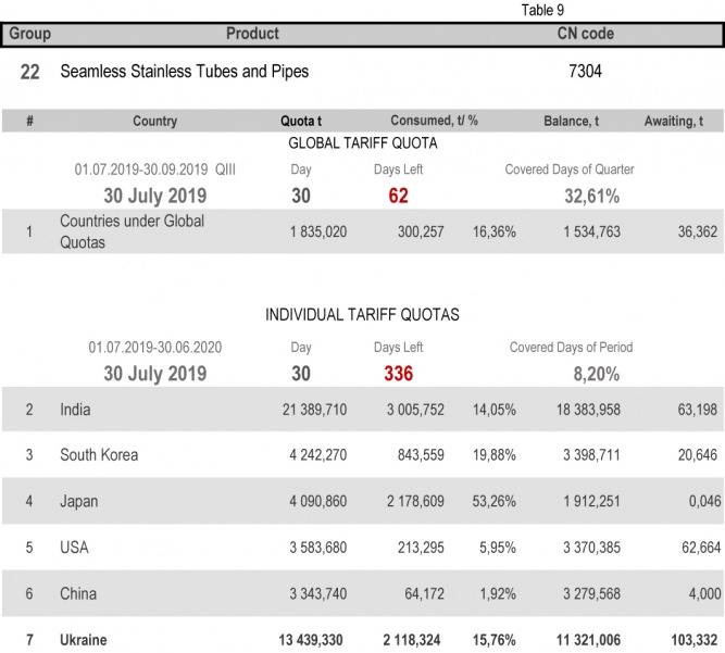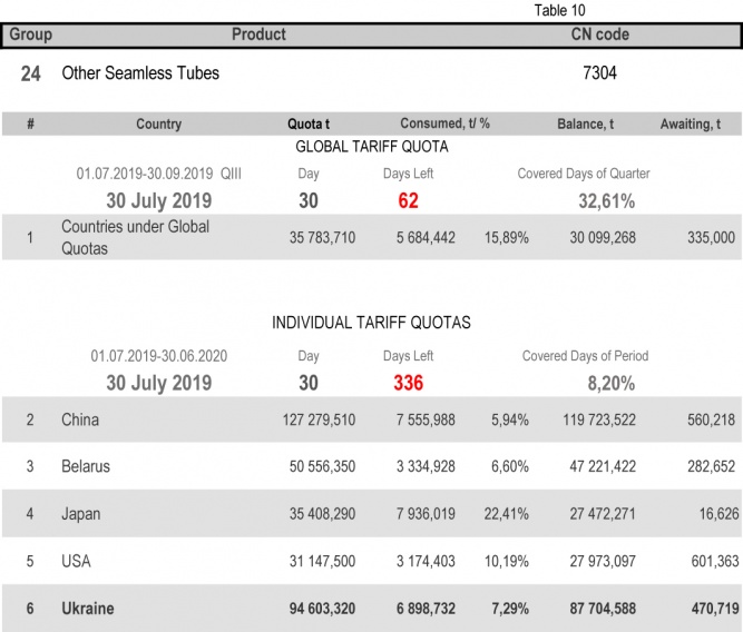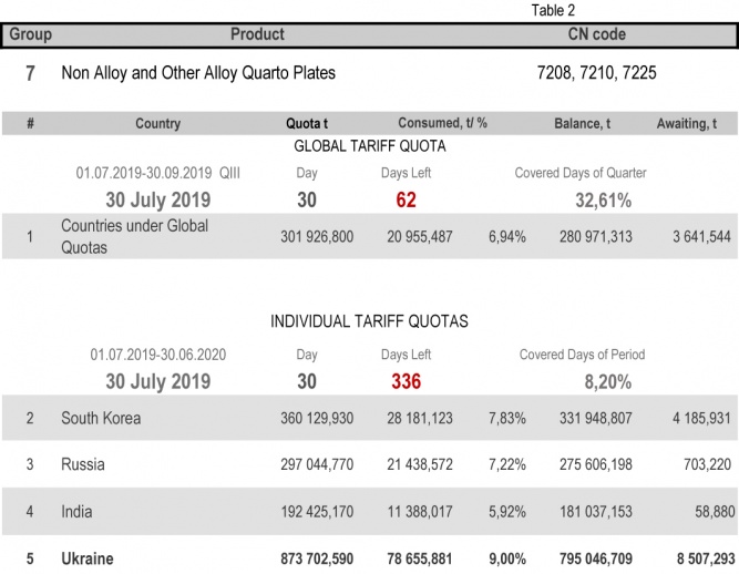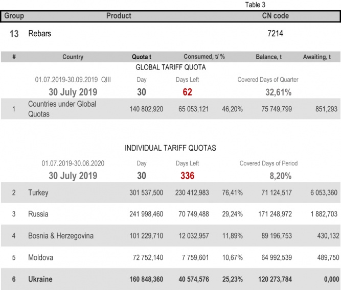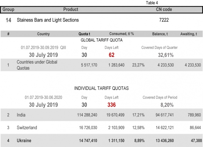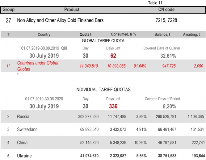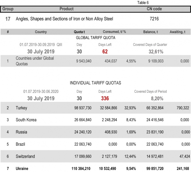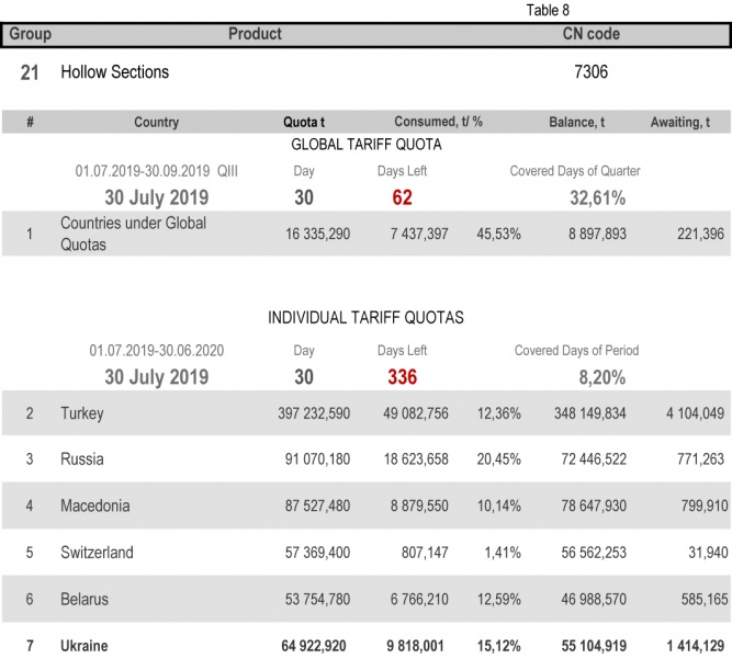 For categories in which Ukraine is a participant of the global tariff quota, on state of 30th July 2019 (32.61% of the covered quarter), 24.79% had been consumed in category 1 (non-alloy and other alloy hot rolled sheets and strips) and 88.11% in category 20 (gas pipes). More detailed