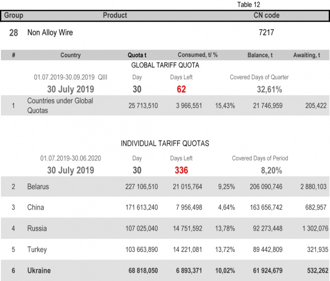 On state of 30th July 2019 (8.20% of the covered period) the most consumed individual tariff quota is in category 13 (rebars) – the application level is 25.23%. The least consuming is in category 19 (railway materials), 3.29%. More detailed