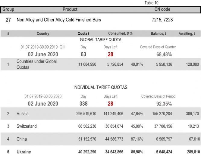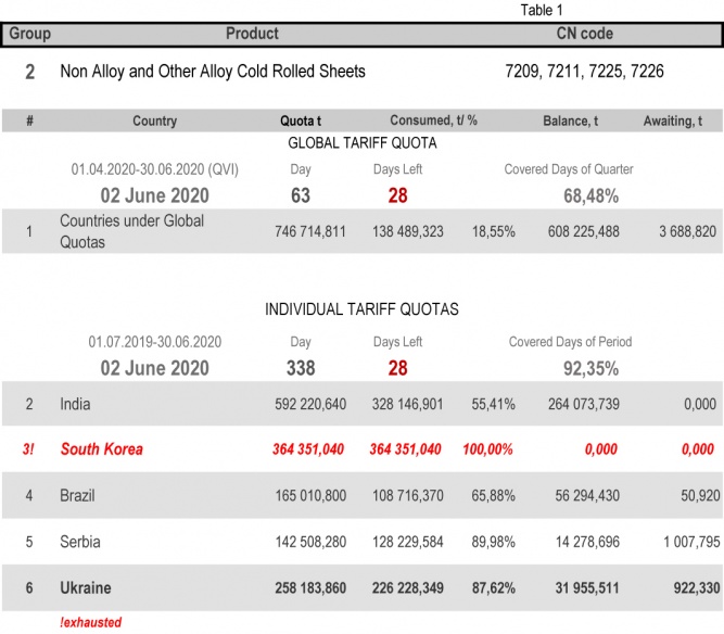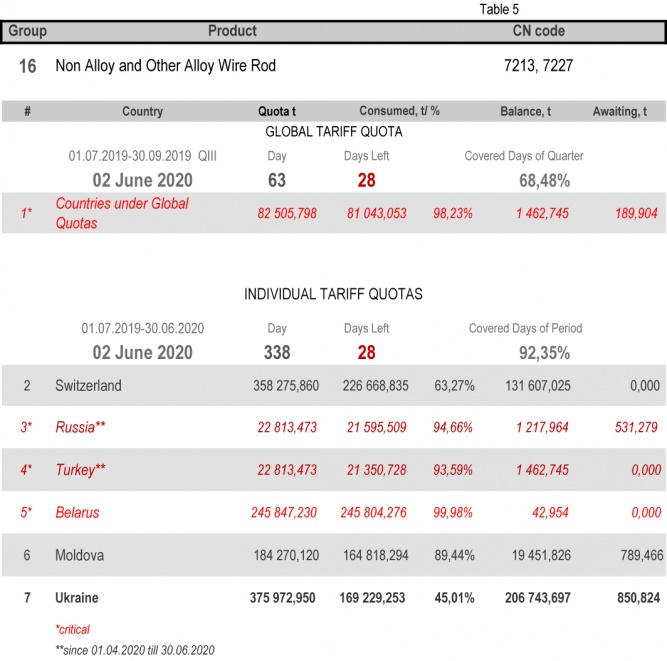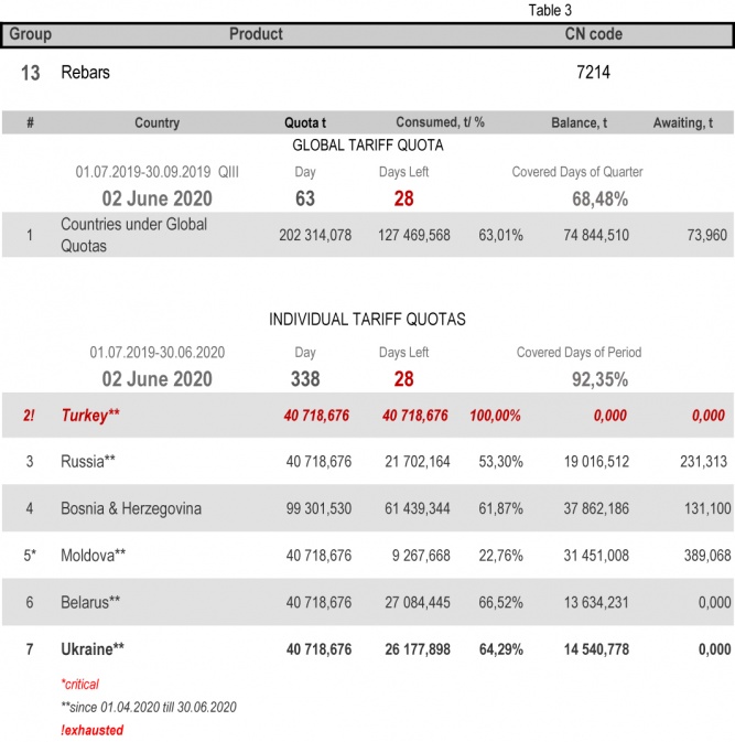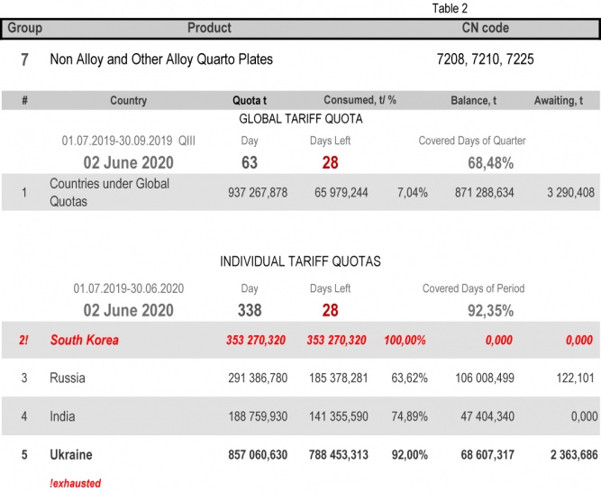 For the category 20 (gas pipes) in which Ukraine is a participant of the global tariff quota, on state of 2nd June 2020 (68.48% of the covered quarter), the consuming level is 91.84%. More detailed http://www.ukrmetprom.org/tariff-quota-usage-ukrainian-steel-products-import-eu-daily-monitoring-15-07-2019/