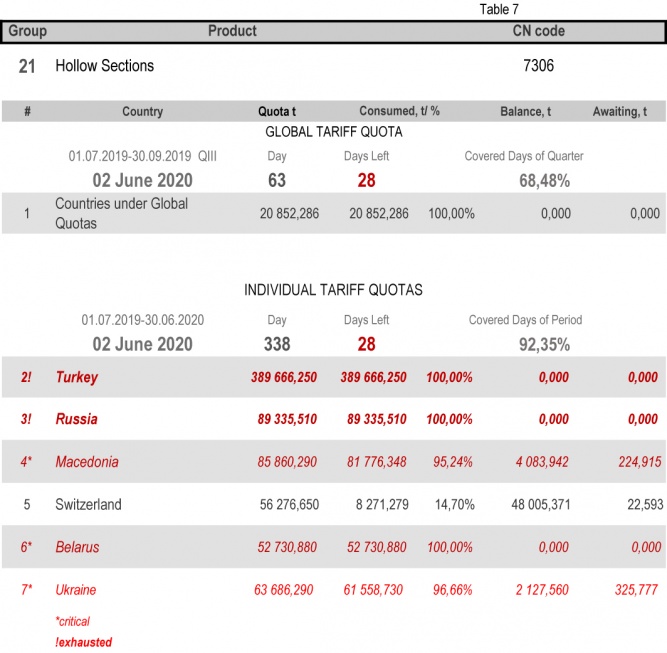 - Category 21 (Hollow Sections): the global tariff quota and the individual tariff quota of the 2nd period for Turkey, Russia and Belarus;