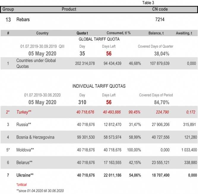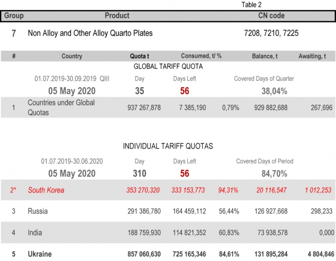 For the category 20 (gas pipes) in which Ukraine is a participant of the global tariff quota, on state of 47h May 2020 (38.04% of the covered quarter), the consuming level is 61.82%. More detailed http://www.ukrmetprom.org/tariff-quota-usage-ukrainian-steel-products-import-eu-daily-monitoring-15-07-2019/