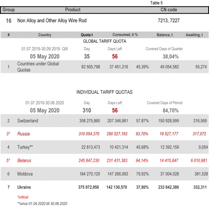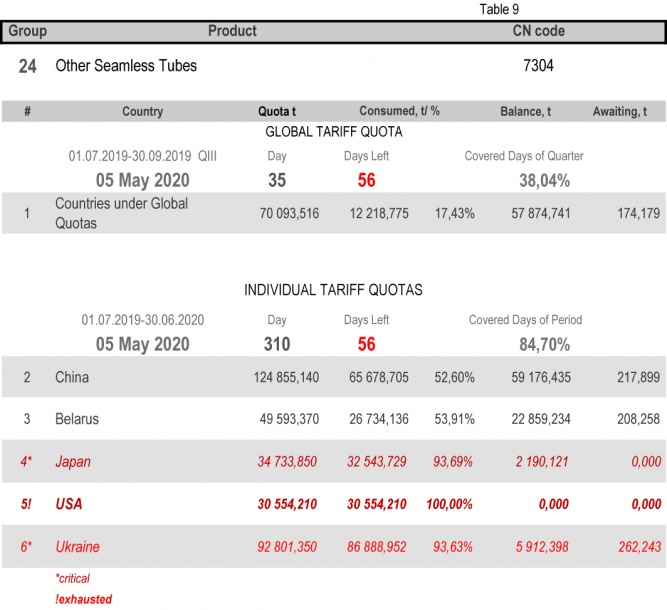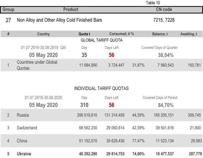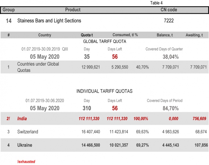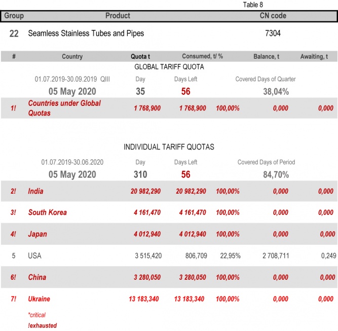 On state of 4th May 2020 (84.70% of the covered period) Ukraine had fully consumed the individual tariff quota in category 22 (Seamless Stainless Tubes and Pipes)/ The least consuming is in category 17 (Angles, Shapes and Sections of Iron or Non Alloy Steel), 35.08%.