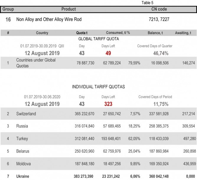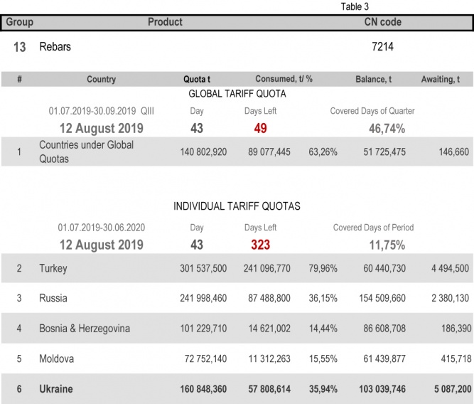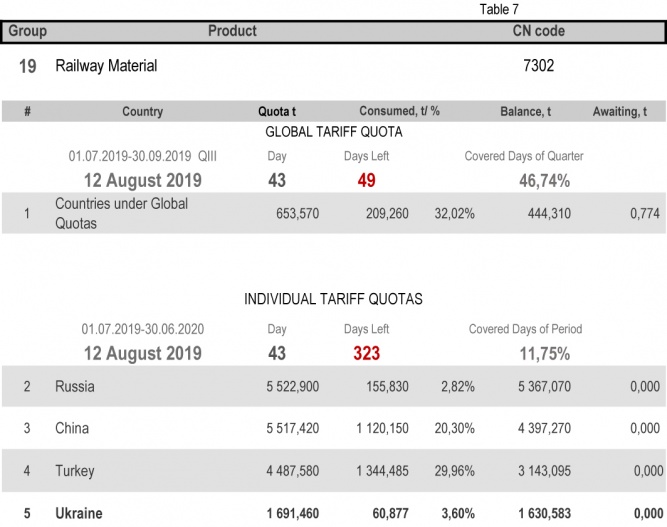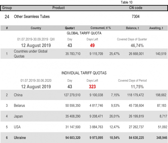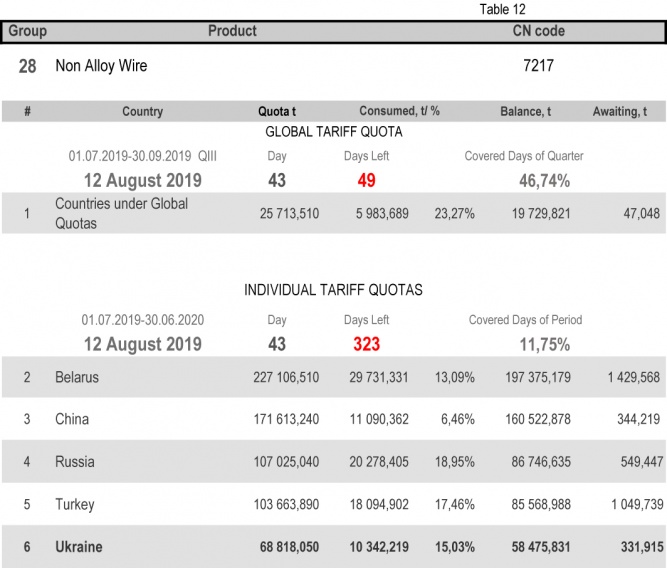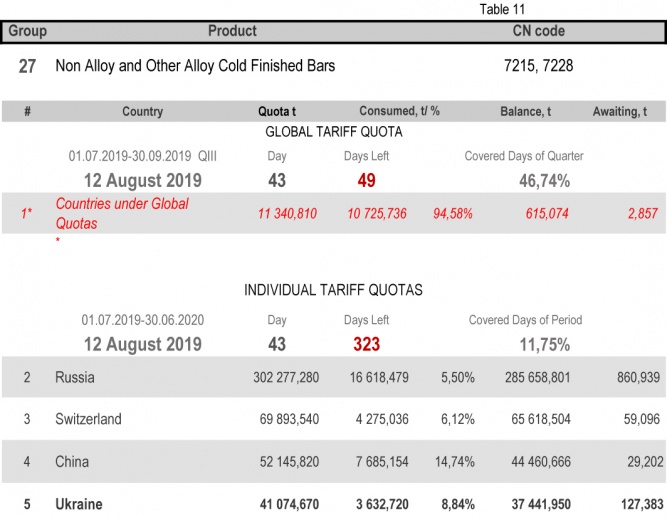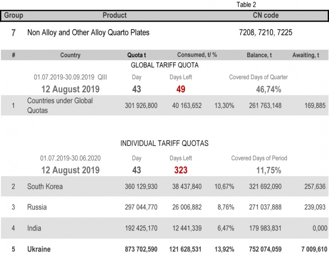 For categories in which Ukraine is a participant of the global tariff quota, on state of 12th August 2019 (46.74% of the covered quarter), 33.78% had been consumed in category 1 (non-alloy and other alloy hot rolled sheets and strips). The quota in category 20 (gas pipes) is fully exhausted. More detailed http://www.ukrmetprom.org/tariff-quota-usage-ukrainian-steel-products-import-eu-daily-monitoring-15-07-2019/