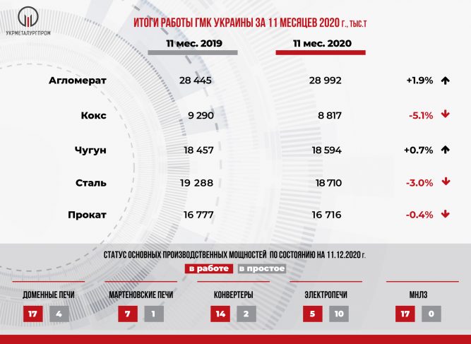 По уточненным данным ОП «Укрметаллургпром», в январе-ноябре 2020 г. металлургическими предприятиями Украины изготовлено: