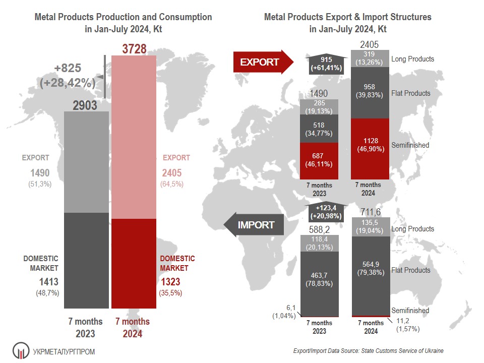 According to Association UKRMETALURGPROM, in Jan-July of 2024 Ukrainian steelmakers had produced 3728 Kt of metal products (128.4% to the same period of 2023), of which according to the State Customs Service of Ukraine, it was exported 2405 Kt or 64.5%. For the same period of 2023, the share of export was 51.3% (1490 Kt with the total metal products production up to 2903 Kt).