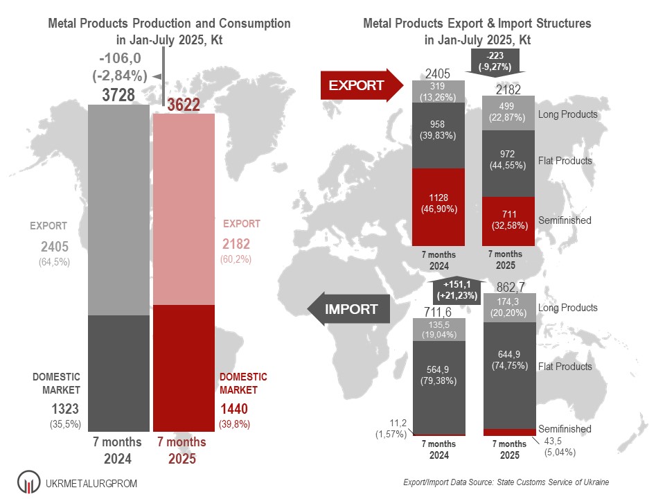 According to Association UKRMETALURGPROM, in Jan-July of 2025 Ukrainian steelmakers had produced 3622 Kt of metal products (97.2% to the same period of 2024), of which according to the State Customs Service of Ukraine, it was exported 2182 Kt or 60.2%. For the same period of 2024, the share of export was 64.5% (2405 Kt with the total metal products production up to 3728 Kt).