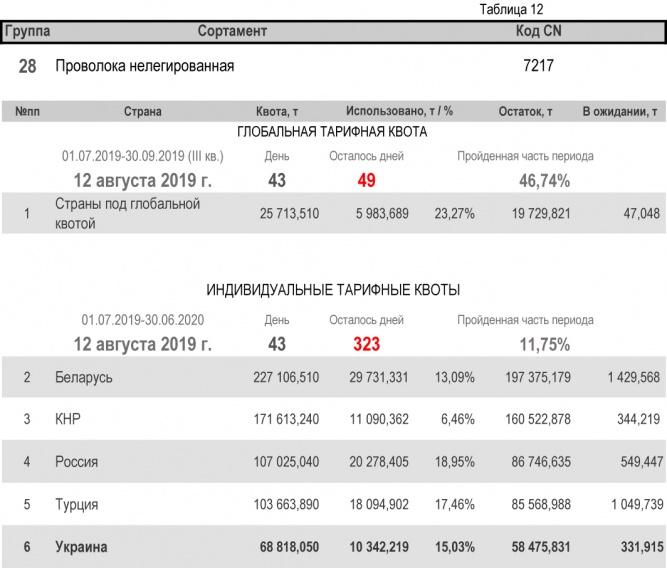 Что касается групп, относительно которых Украина является участником глобальной тарифной квоты, то, по состоянию на 12 августа 2019 г. (46,74% продолжительности текущего квартала) степень использования квоты по группе 1 (горячекатаный плоский прокат из нелегированной и легированной стали) составила 33,78%. Квота по группе 2 (трубы газопроводные) исчерпана полностью. Подробнее здесь.