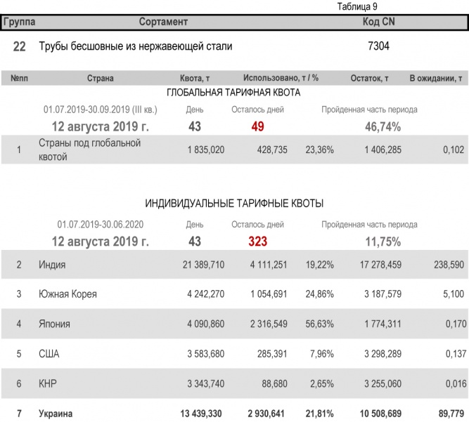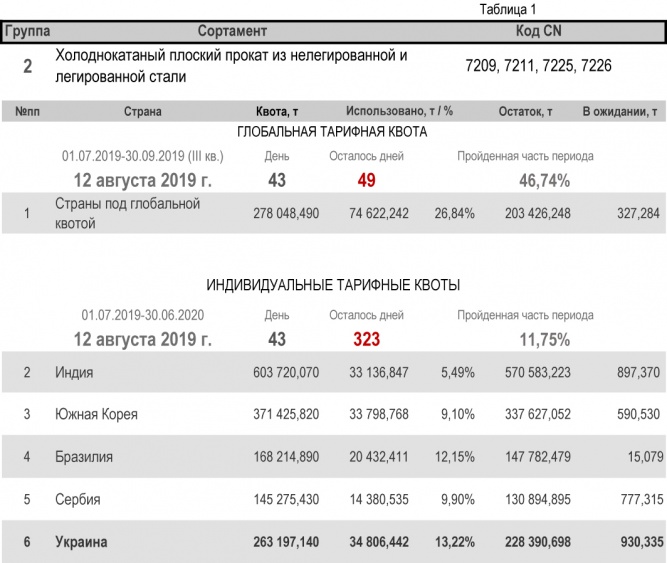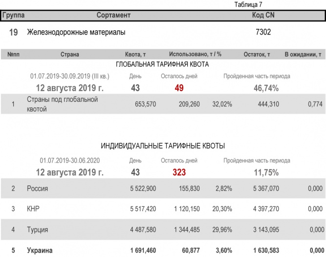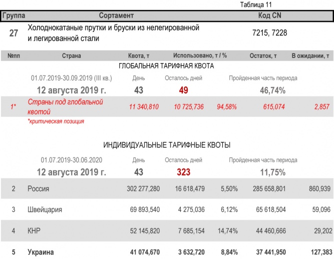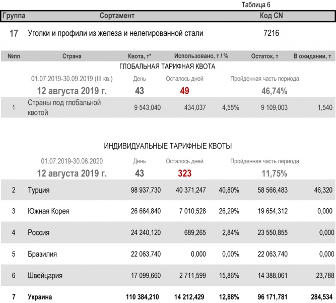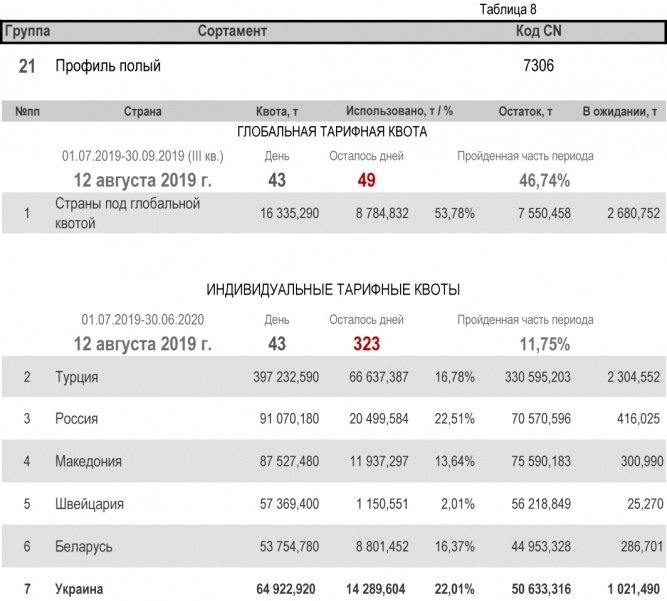 Что касается групп, относительно которых Украина является участником глобальной тарифной квоты, то, по состоянию на 12 августа 2019 г. (46,74% продолжительности текущего квартала) степень использования квоты по группе 1 (горячекатаный плоский прокат из нелегированной и легированной стали) составила 33,78%. Квота по группе 2 (трубы газопроводные) исчерпана полностью. Подробнее здесь.