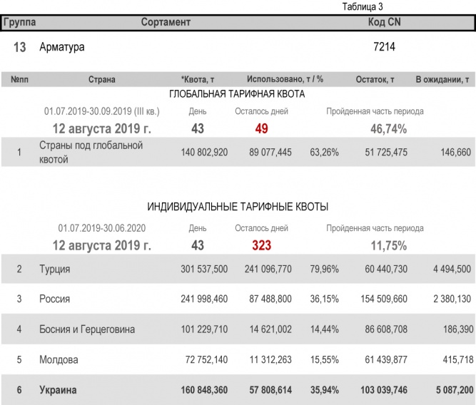 По состоянию на 12 августа 2019 г., при пройденной части первого периода в 11,75%, больше всего Украиной израсходовано индивидуальной тарифной квоты по группе 13 (арматура) – здесь уровень использования составил 35,94%. Наименьший расход — в группе 19 (железнодорожные материалы) с уровнем использования 3,60%. Подробнее здесь.