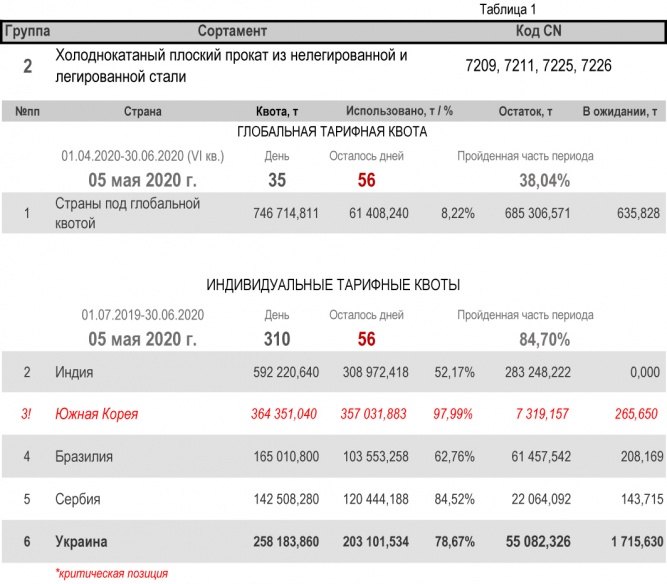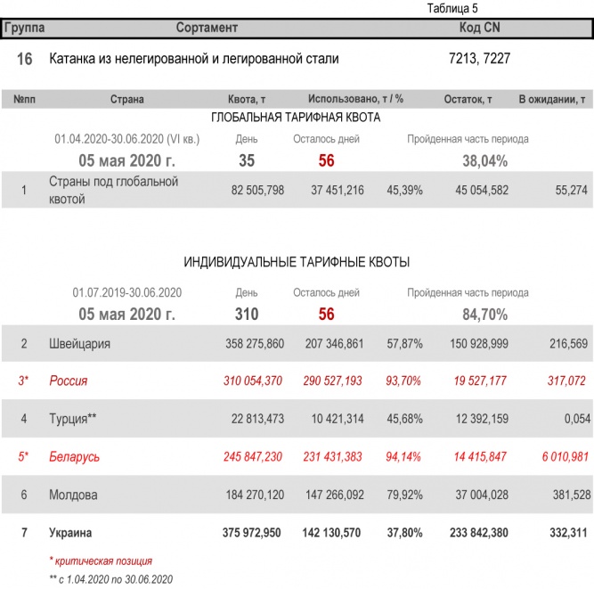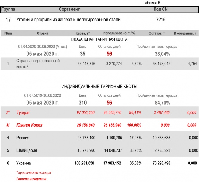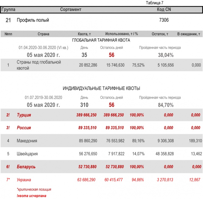 По состоянию на 4 мая 2020 г., при пройденной части второго периода в 84,70%, Украиной полностью исчерпана индивидуальная тарифная квота по группе 22 (трубы бесшовные из нержавеющей стали). Наименьший расход — в группе 17 (уголки и профили из железа и нелегированной стали) с уровнем использования 35,08%.