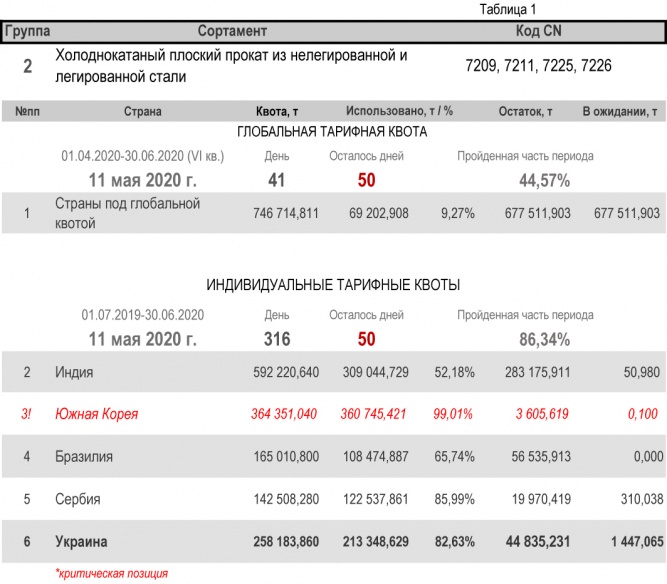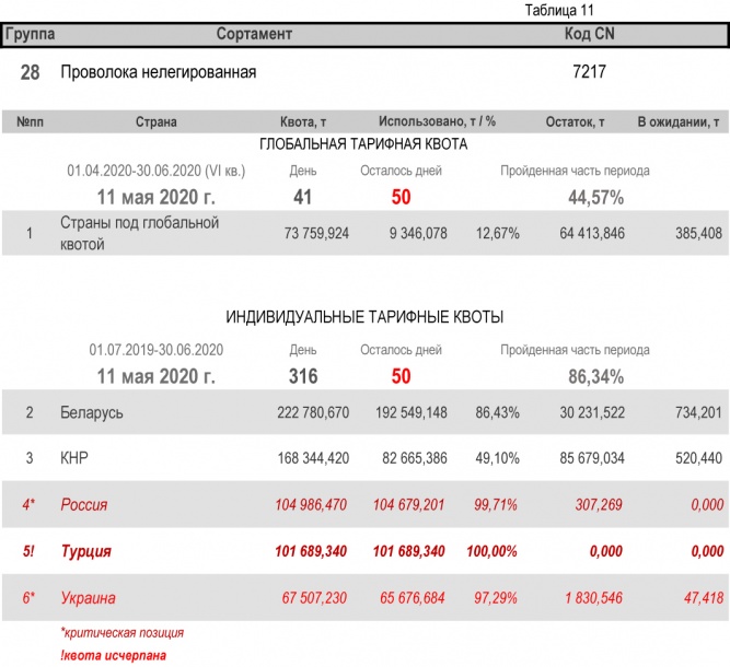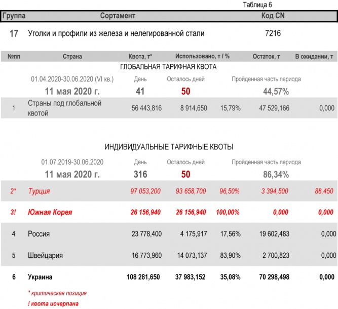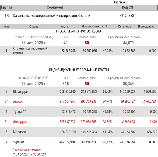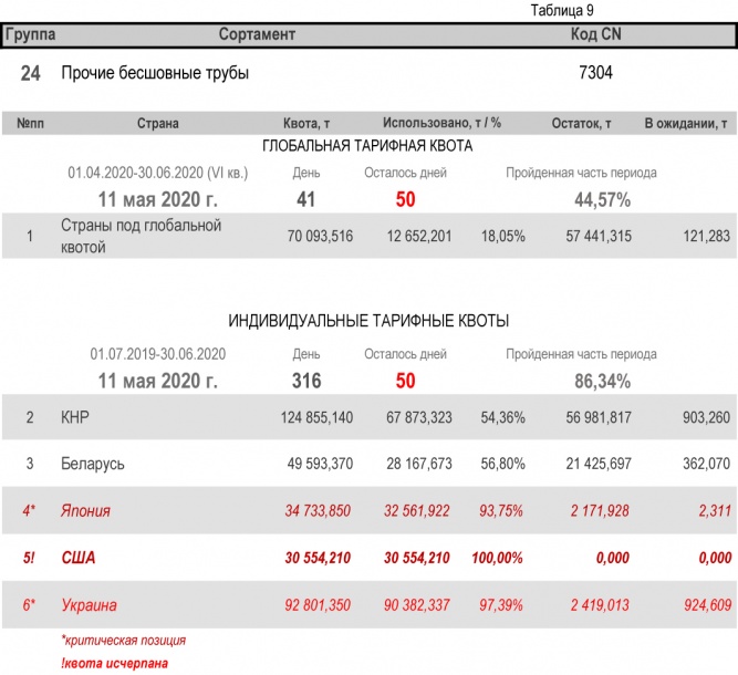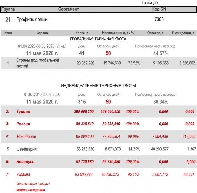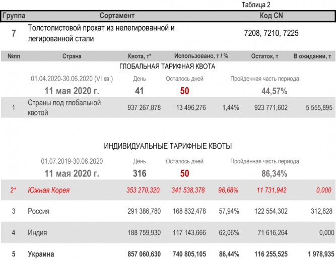 По состоянию на 11 мая 2020 г., при пройденной части второго периода в 86,34%, Украиной полностью исчерпана индивидуальная тарифная квота по группе 22 (трубы бесшовные из нержавеющей стали). Наименьший расход — в группе 17 (уголки и профили из железа и нелегированной стали) с уровнем использования 35,08%.