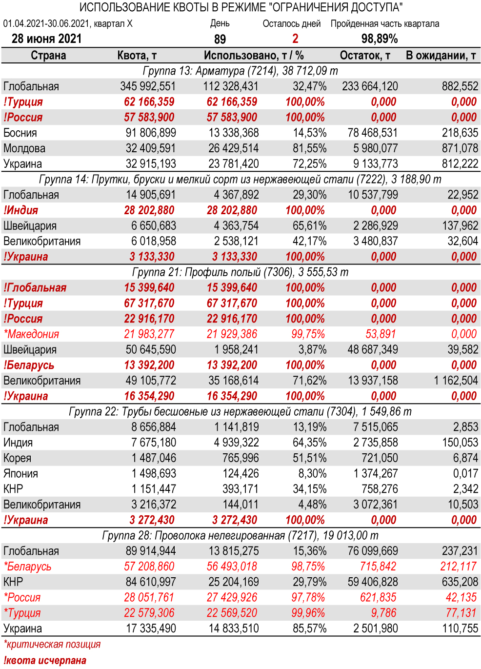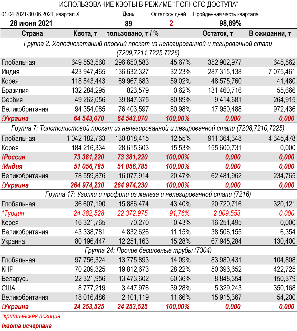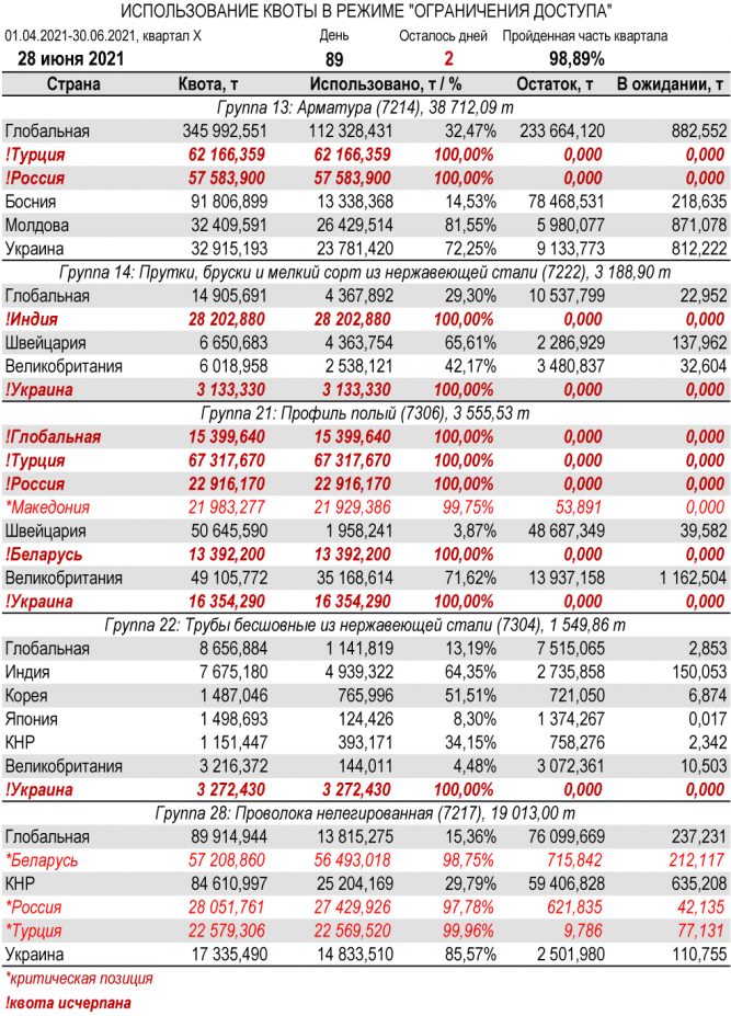 По состоянию на 28 июня 2021 г., при пройденной части завершающего квартала III периода в 98,89%, Украиной полностью исчерпана индивидуальная тарифная квота по группам 2 (холоднокатаный плоский прокат из нелегированной и легированной стали), 7 (толстолистовой прокат из нелегированной и легированной стали), 14 (прутки, бруски и мелкий сорт из нержавеющей стали), 21 (профиль полый), 22 (трубы бесшовные из нержавеющей стали), 24 (прочие бесшовные трубы) и 27 (холоднокатаные прутки и бруски из нелегированной и легированной стали). Наименьший расход — в группе 17 (уголки и профили из железа и нелегированной стали, 15,28%).