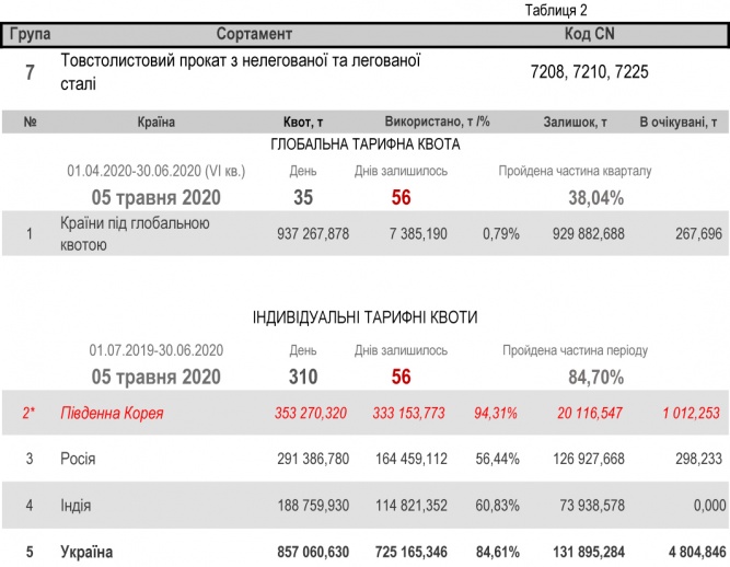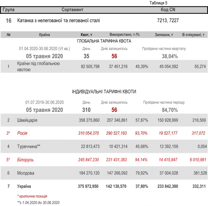 Станом на 4 травня 2020 р., при пройденій частині першого періоду в 84,70%, Україною повністю вичерпано індивідуальну тарифну квоту в групі 22 (труби безшовні з нержавіючої сталі). Найменший розхід – в групі 17 (кутики та профіль з заліза та нелегованої сталі) з рівнем використання 35,08%.