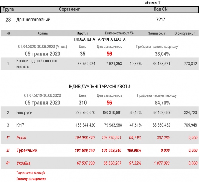 - група 28 (дріт нелегований): вичерпано індивідуальну тарифну квоту другого періоду для Туреччини.