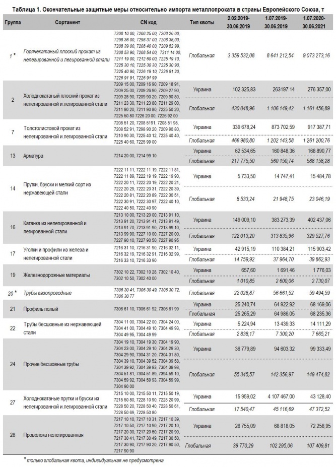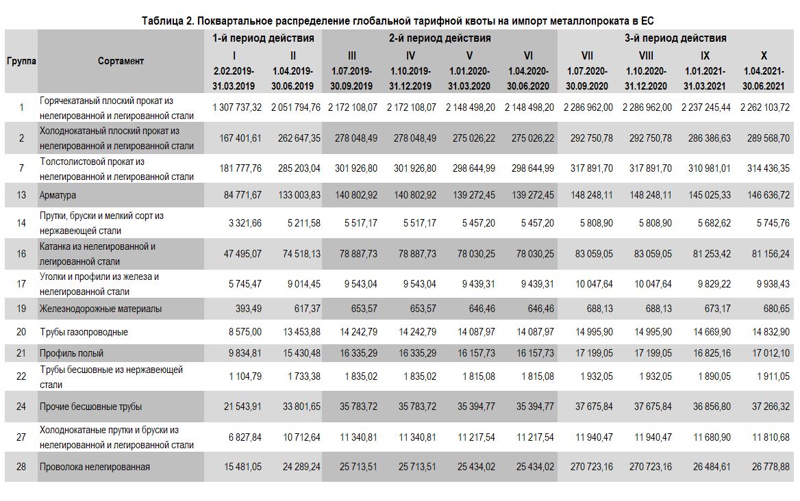 Указанные меры представляют собой индивидуальные (т.е. для конкретной страны) и глобальные тарифные квоты, после исчерпания которых будет применяться пошлина в размере 25%. Индивидуальные квоты используются по годичному принципу, а глобальные – по квартальному, а невыбранные объемы предыдущего квартала переходят в последующий.