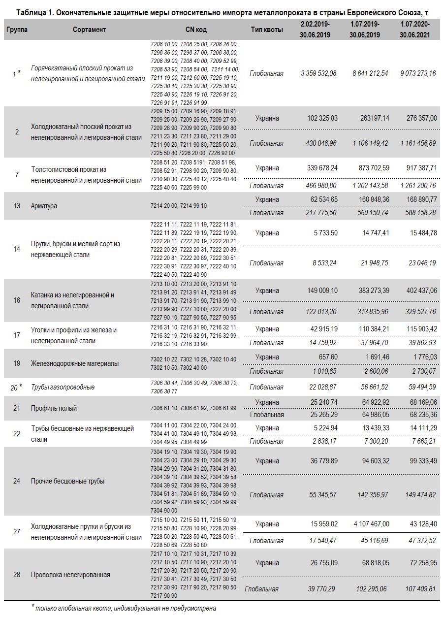 Металлопрокат происхождением из Украины подпадает под тарифные квоты по 14 товарным группам, из которых на 12 устанавливаются индивидуальные, а на две (группа 1 и группа 20) – глобальные тарифные квоты. Тут следует отметить, что к 11 группам товарной продукции, в рамках которых на Украину распространялись предварительные защитные меры, добавилось еще 3, а именно группа 19 (железнодорожные материалы), группа 24 (прочие бесшовные трубы) и группа 27 (холоднокатаные прутки и бруски из нелегированной и легированной стали).