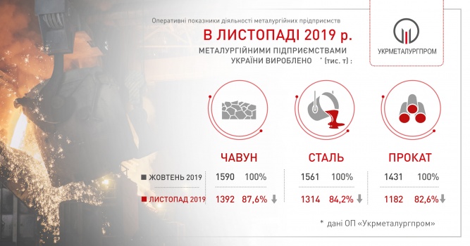 За попередніми даними ОП «Укрметалургпром», в листопаді 2019 р. металургійними підприємствами України вироблено: чавуну 1,39 млн т (87,6% відносно жовтня 2019 р.), сталі 1,31 млн т (84,2%), прокату 1,18 млн т (82,6%).