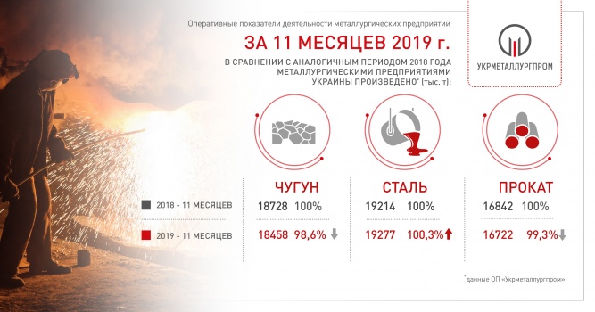 По предварительным данным ОП «Укрметаллургпром», в ноябре 2019 г. металлургическими предприятиями Украины произведено: чугуна 1,39 млн т (87,6% относительно октября 2019 г.), стали 1,31 млн т (84,2%), проката 1,18 млн т (82,6%).