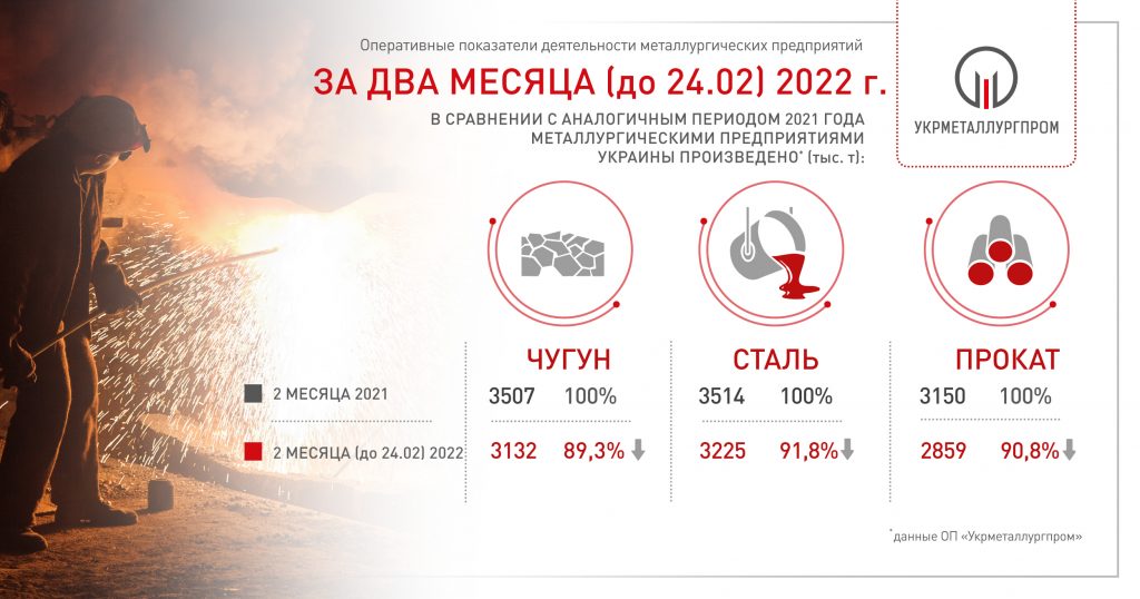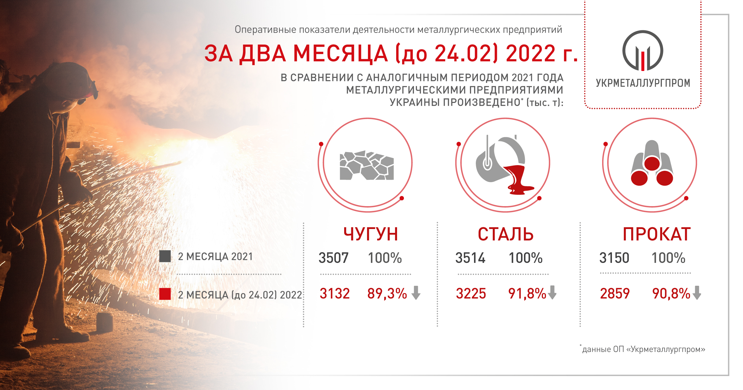 По предварительным данным ОП «Укрметаллургпром», за два месяца (до 24.02) 2022 года произведено: