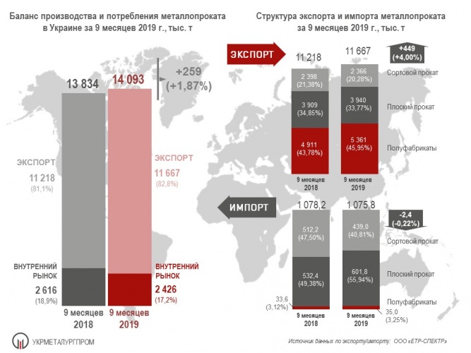 По данным ОП «Укрметаллургпром», за 9 месяцев 2019 г. украинскими металлургическими предприятиями произведено 14,09 млн т металлопроката (102% относительно аналогичного периода 2018 г.), из которых, по информации ООО «ЕТР-Спектр», экспортировано порядка 11,67 млн т, или 82,8%. В аналогичном периоде 2018 г. доля экспорта составила 81,1% (11,22 млн т при общем производстве металлопроката 13,83 млн т).