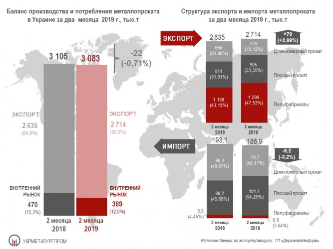 По данным ОП «Укрметаллургпром», за два месяца 2019 г. украинскими металлургическими предприятиями произведено 3,08 млн т металлопроката (99,3% относительно аналогичного периода 2018 г.), из которых, по информации ГП «Держаналітінформ», экспортировано порядка 2,71 млн т, или 88,0%. В аналогичном периоде 2018 г. доля экспорта составила 84,8% (2,64 млн т при общем производстве металлопроката 3,11 млн т). Одной из причин повышенной экспортной активности в январе-феврале текущего года является стремление к максимальному использованию глобальной тарифной квоты, введенной Европейской Комиссией в качестве промежуточной, а, затем, и окончательной защитной меры против импорта металлопродукции на территорию ЕС.