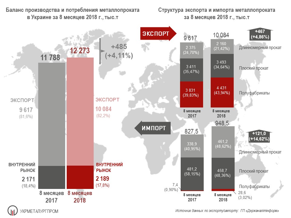 По данным ОП «Укрметаллургпром», за 8 месяцев 2018 г. украинскими металлургическими предприятиями произведено 12,27 млн.т металлопроката (104% относительно аналогичного периода 2017 г. с учетом деятельности в январе-феврале 2017 г. мощностей на НКТ, или 108% без их учета), из которых, по информации ГП «Держаналітінформ», экспортировано порядка 10,1 млн.т, или 82,2%. Это несколько выше аналогичного периода 2017 г., доля экспорта в который составила 81,6% (9,62 млн.т при общем производстве металлопроката 11,79 млн.т).
