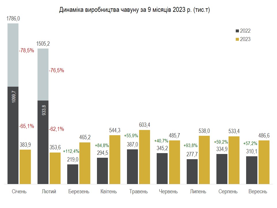 - чавуну 4,39 млн т (80,5% відносно січня-вересня 2022 р.);