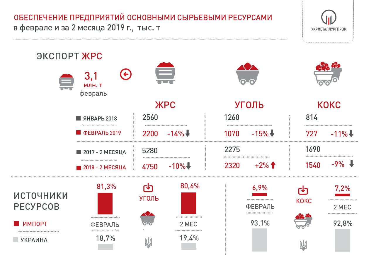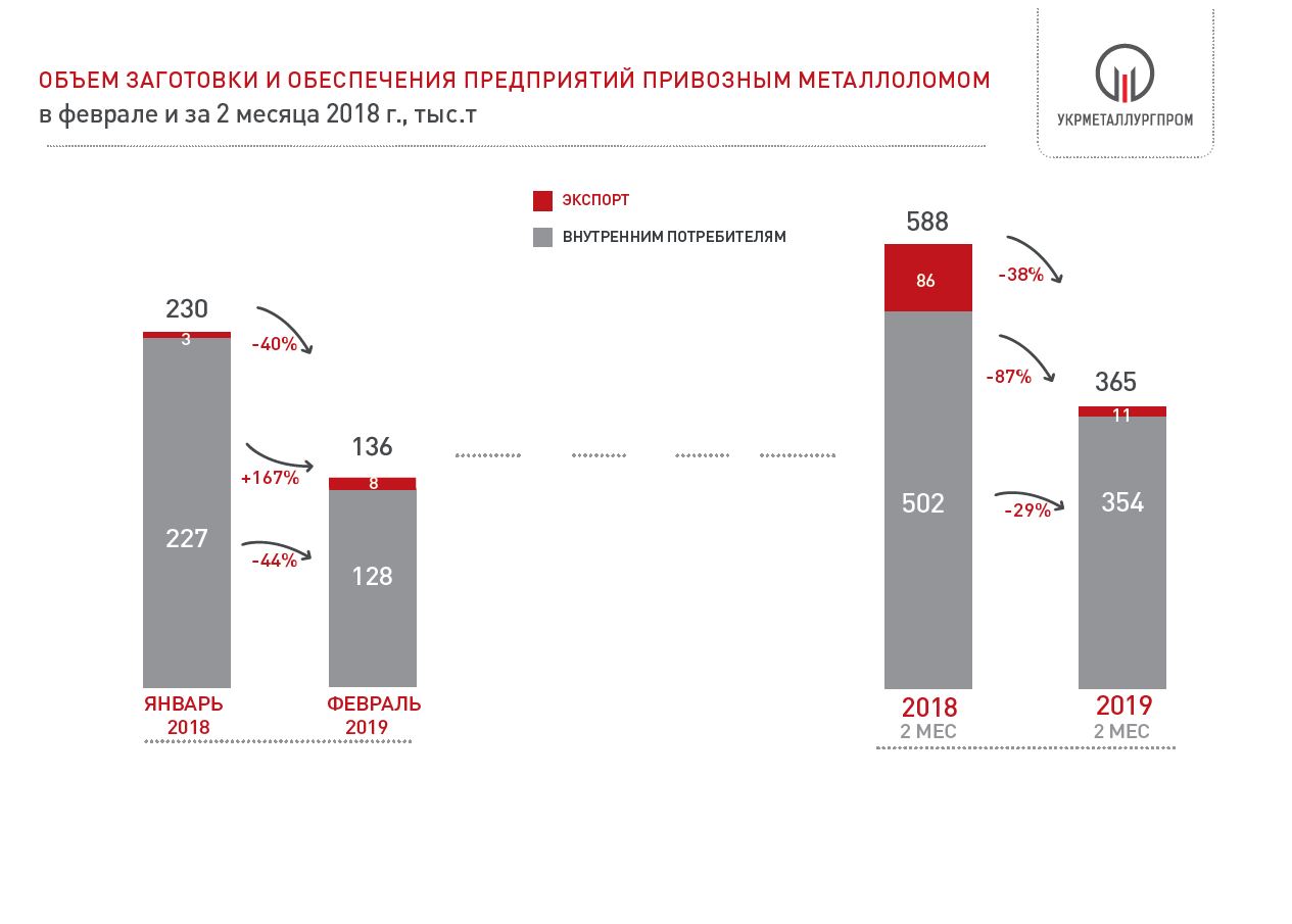 За 2 месяца 2019 года из заготовленных 365 тыс.т лома (62% относительно аналогичного периода 2018 г.) украинским потребителям в качестве привозного поставлено 354 тыс.т (71% относительно аналогичного периода 2018 г.), экспортировано 11 тыс.т (13% относительно аналогичного периода 2018 г.).