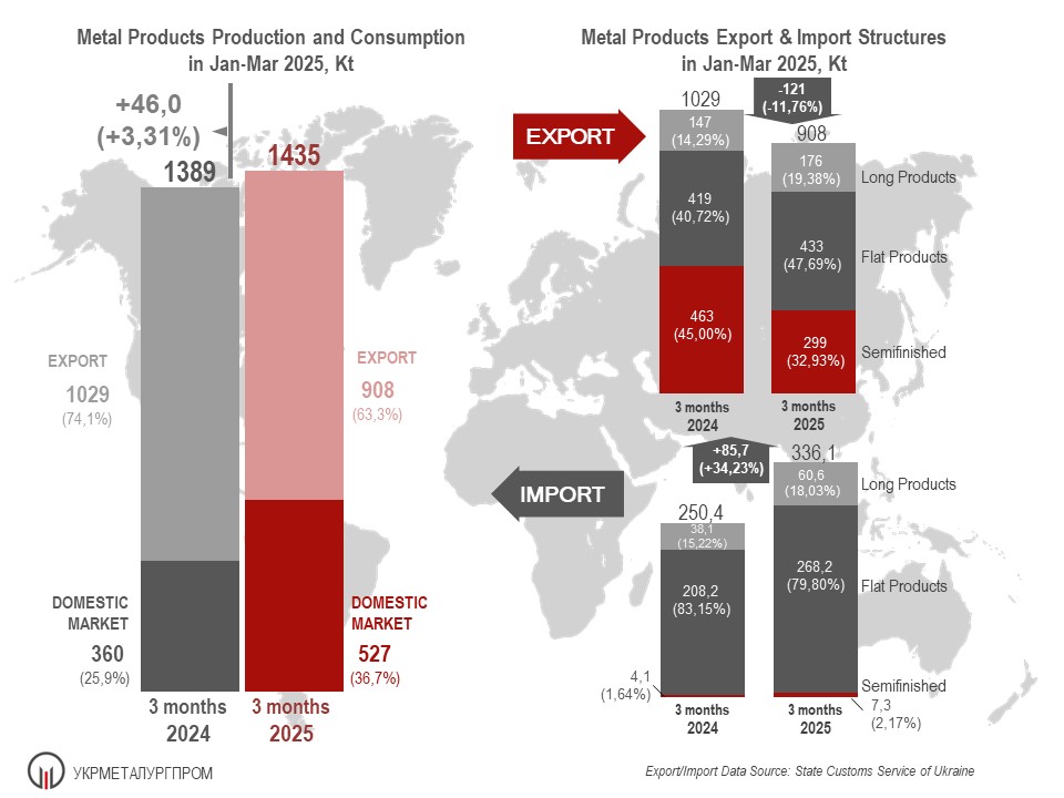According to Association UKRMETALURGPROM, in Jan-Mar of 2025 Ukrainian steelmakers had produced 1435 Kt of metal products (103.3% to the same period of 2024), of which according to the State Customs Service of Ukraine, it was exported 908 Kt or 63.3%. For the same period of 2024, the share of export was 74.1% (1029 Kt with the total metal products production up to 1389 Kt).