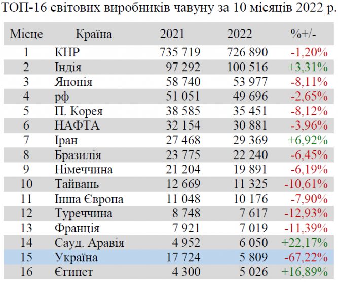 Україна (5,81 млн т або 32,78% відносно січня-жовтня 2021 р.) обіймає 15-ту позицію серед 40 країн-виробників чавуну.