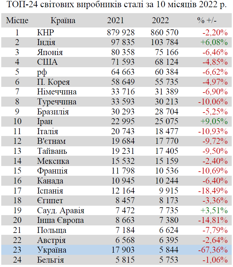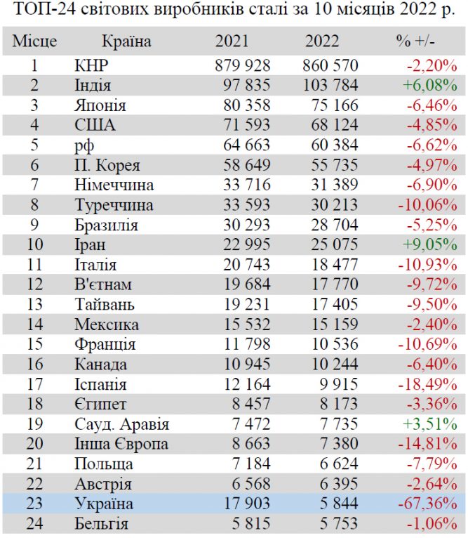 Україна (5,84 млн т або 32,64% відносно січня-жовтня 2021 р.) обіймає 23-тє місце серед 64 країн-виробників сталі.