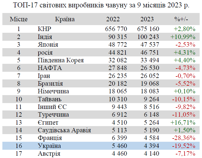 Україна (4,39 млн т або 80,48% відносно січня-вересня 2022 р.) обіймає 16 позицію серед 40 країн-виробників чавуну.