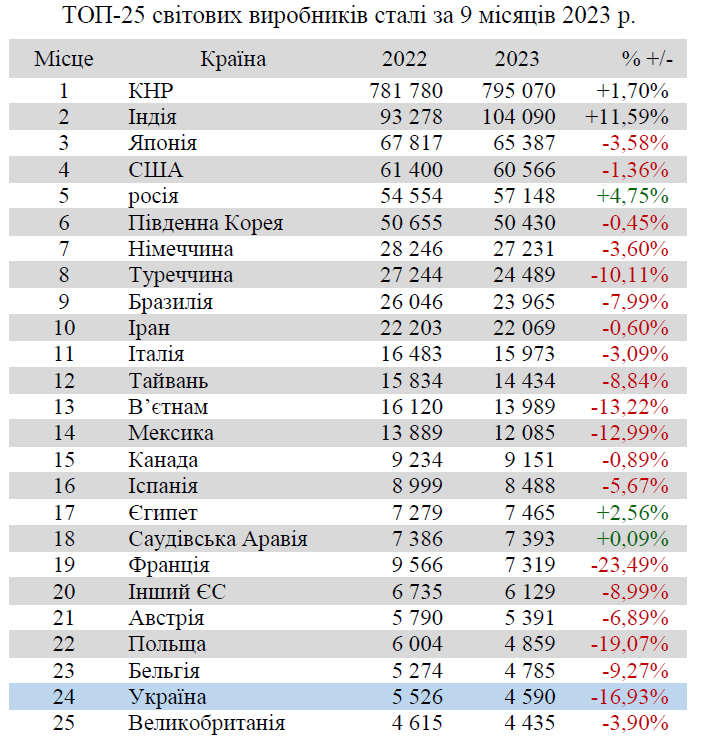 Україна (4,59 млн т або 83,07% відносно січня-вересня 2022 р.) обіймає 24 місце серед 64 країн-виробників сталі.