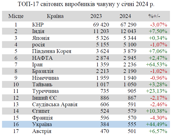 Україна (0,56 млн т або 144,49% відносно січня 2023 р.) обіймає 16 позицію серед 40 країн-виробників чавуну.