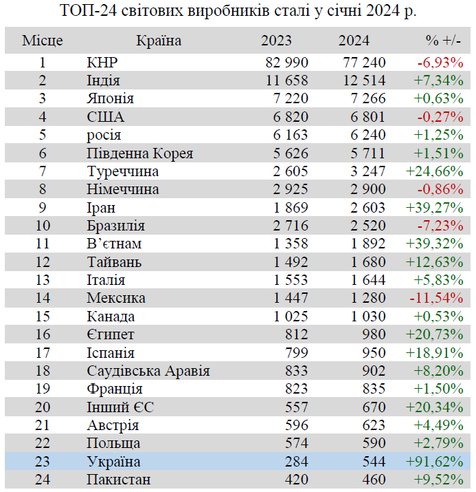 Україна (0,54 млн т або 191,62% відносно січня 2023 р.) обіймає 23 місце серед 71 країни-виробника сталі.