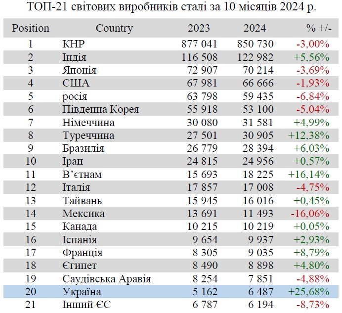 Україна (6,49 млн т або 125,68% відносно січня-жовтня 2023 р.) залишається на 20 місці серед 71 країни-виробника сталі.