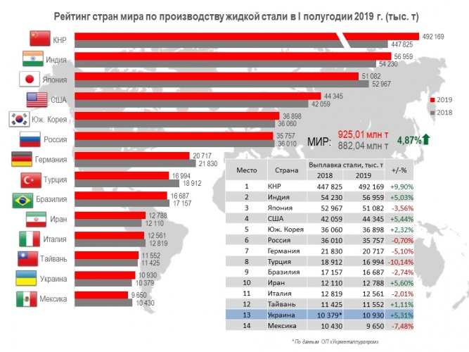 Среди 62 стран-производителей стали, Украина по-прежнему занимает 13-е место (10,93 млн т, или 105,3% относительно января-июня 2018 г.).
