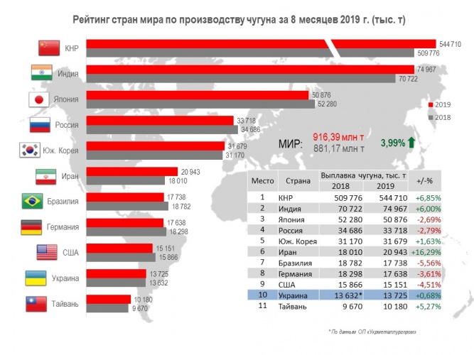 Украина находится на 10-м месте среди 40 стран-производителей чугуна (13,73 млн т, или 100,68% относительно 8 месяцев 2018 г.).