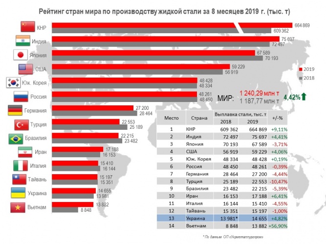 Среди 62 стран-производителей стали, Украина по-прежнему занимает 13-е место (14,66 млн т, или 104,82% относительно января-августа 2018 г.).