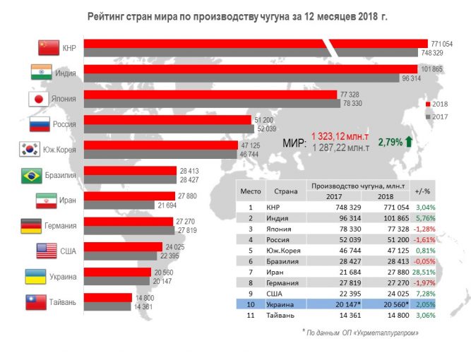 Украина занимает 10 место среди 44 стран-производителей чугуна (20,56 млн.т, 102,05% относительно 2017 г.).